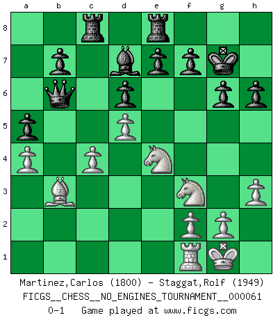 Last move : 0-1 2013 May 26 23:44:22 [Event "FICGS__CHESS__NO_ENGINES_TOURNAMENT__000061"] [Site "FICGS"] [Date "2013.01.21"] [Round "1"] [White "Martinez,Carlos"] [Black "Staggat,Rolf"] [Result "0-1"] [WhiteElo "1800"] [BlackElo "1949"] 1.e4 c5 2.Nf3 d6 3.Nc3 Nf6 4.d4 cxd4 5.Nxd4 g6 6.Bc4 Bg7 7.O-O O-O 8.Bg5 Bd7 9.Qd2 Re8 10.Rae1 Nc6 11.Nf3 Rc8 12.Bh6 Bh8 13.Ng5 Ne5 14.Bb3 Nc4 15.Qd5 Nxd5 16.exd5 Nd2 17.Nce4 Nxf1 18.Rxf1 a5 19.a4 Bxb2 20.c4 Bg7 21.Bxg7 Kxg7 22.h3 h6 23.Nf3 Qb6 0-1 Sicilian Kingside Castling by player White (move 7) Kingside Castling by player Black (move 7) Player Black won this chess game. Follow this game move after move (download)Chess is imagination. (David Bronstein) Ich weiss nicht was Gott gegen mich auf 1.e4 antworten würde. (Robert James Fischer) Aunque la mayoría de la gente disfruta observar las partidas de los grandes Maestros de ataque, algunos de los jugadores mas notables en la historia han sido los jugadores silenciosos posicionales. Lentamente ellos te aplastan despojandote de tu espacio, congestionando tus piezas y dejandote virtualmente sin nada que hacer. (Yasser Seirawan) Les réformistes prétendent que les progrès de la théorie conduiront à la disparition des échecs, et qu'il faut, pour leur rendre vie, en remanier les règles. En réalité, qu'exprime cette affirmation? Le mépris de l'intuition, de l'imagination et de tous les autres éléments qui font des échecs un art. (Alexander Alekhine) Nowadays, anyone who cannot speak English and is incapable of using the Internet is regarded as backward. (Al-Waleed bin Talal)