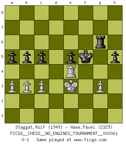 Last move : 0-1 2013 June 17 19:25:7 [Event "FICGS__CHESS__NO_ENGINES_TOURNAMENT__000061"] [Site "FICGS"] [Date "2013.01.21"] [Round "1"] [White "Staggat,Rolf"] [Black "Hase,Pavel"] [Result "0-1"] [WhiteElo "1949"] [BlackElo "2329"] 1.Nf3 Nf6 2.d3 d5 3.Nbd2 Nc6 4.g3 Bg4 5.Bg2 e5 6.e4 dxe4 7.dxe4 Qd7 8.O-O O-O-O 9.Qe1 h5 10.h4 Bh3 11.Nc4 Bxg2 12.Kxg2 Ng4 13.c3 Bc5 14.Ne3 f6 15.Bd2 Qd3 16.Qb1 Qxb1 17.Raxb1 Rxd2 18.Nxd2 Bxe3 19.fxe3 Nxe3+ 20.Kf3 Nxf1 21.Nxf1 Rd8 22.Ke2 Ne7 23.Ne3 c6 24.Rf1 Kd7 25.Nf5 Nxf5 26.Rxf5 Rh8 27.Rf1 Ke7 28.Ke3 g6 29.Rf2 Rd8 30.Rf1 Ke6 31.Ke2 g5 32.Rf5 Rg8 33.hxg5 Rxg5 34.Rf3 f5 35.exf5+ Rxf5 36.Rd3 Rg5 37.Kf2 Rg8 38.Rd1 b5 39.Rh1 Rh8 40.Ke3 Kf5 41.Rh4 Kg5 42.Re4 Re8 43.Ke2 a5 44.a3 c5 45.b3 Kf5 46.Rh4 Rh8 47.Ke3 Rh6 48.Re4 Rg6 0-1 Reti Opening Kingside Castling by player White (move 8) Queenside Castling by player Black (move 8) Player Black won this chess game. Follow this game move after move (download)The tactician knows what to do when there is something to do; whereas the strategian knows what to do when there is nothing to do. (Gerald Abrahams) Mit sehr nachdenklichem Gesicht schreitet Bobby durch den Turniersaal. Was ist passiert?, fragt Lombardy. Ich stehe schlecht, antwortet Fischer. Lombardy: Dann biete doch einfach Remis an. Fischer: So schlecht stehe ich nun auch wieder nicht! (Robert James Fischer) Tu sabes, camarada Pachman, no disfruto el ser un Ministro, preferería jugar al Ajedrez como tu. (Che Guevara) Ne tendez aucun piège pour le plaisir ! Ne jouez rien dans l'espoir que l'adversaire réagisse de façon stupide ! Prenez toujours pour acquis que l'adversaire va trouver le meilleur coup ! Ne jouez jamais de coup dans l'espoir que l'adversaire ne voie pas la menace ! Chacun de vos coups doit améliorer la position d'une façon ou d'une autre. It is a good thing for an uneducated man to read books of quotations. (Winston Churchill)