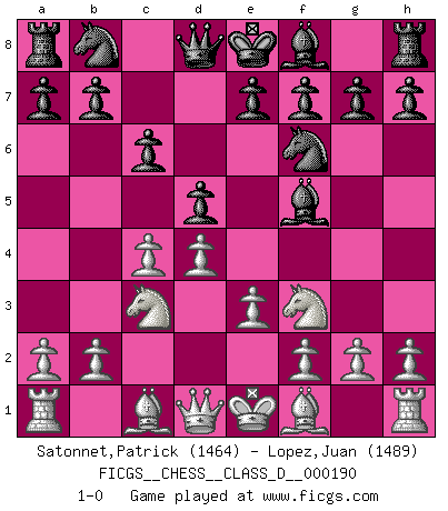 Last move : 1-0 2013 March 10 5:28:20 [Event "FICGS__CHESS__CLASS_D__000190"] [Site "FICGS"] [Date "2013.01.22"] [Round "1"] [White "Satonnet,Patrick"] [Black "Lopez,Juan"] [Result "1-0"] [WhiteElo "1464"] [BlackElo "1489"] 1.d4 d5 2.c4 c6 3.Nc3 Nf6 4.Nf3 Bf5 5.e3 1-0 This chess game has been lost on time (started : 2013.01.22 12:27:15) QGD Slav defense Player White won this chess game. Follow this game move after move (download)Every Pawn is a potential Queen. (James Mason) Schach wird sich dank seiner hohen kulturellen Tradition immer durchsetzen. In näherer Zukunft womöglich sogar als Gegenreaktion auf die maßlose Reizüberflutung im Freizeit- und Spielbereich. (Garry Kasparov) El Ajedrez se juega con la mente... ¡no con las manos!. (Renaud y Kahn) 'L'échange des dames est un coup dur pour les deux adversaires...' Un journaliste lors d'une partie du match Spassky-Fischer Who needs drugs and alcohol if he can play Big Chess at FICGS ? (Heinz-Georg Lehnhoff)