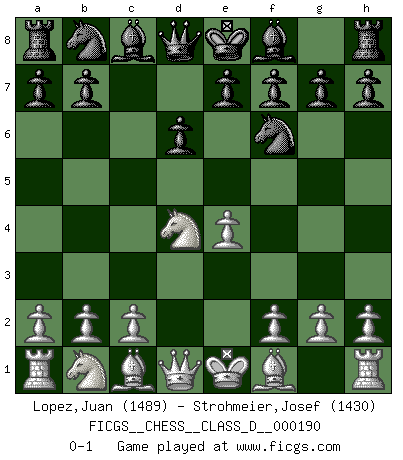 Last move : 0-1 2013 March 7 17:1:6 [Event "FICGS__CHESS__CLASS_D__000190"] [Site "FICGS"] [Date "2013.01.22"] [Round "1"] [White "Lopez,Juan"] [Black "Strohmeier,Josef"] [Result "0-1"] [WhiteElo "1489"] [BlackElo "1430"] 1.e4 c5 2.Nf3 d6 3.d4 cxd4 4.Nxd4 Nf6 0-1 This chess game has been lost on time (started : 2013.01.22 12:27:15) Sicilian Player Black won this chess game. Follow this game move after move (download)A man without frontiers. He didn't divide the East and the West, he brought them together in their admiration for him. (Ljubomir Ljubojevic, about Bobby Fischer's death) Schach ist ein Teil der Kultur, und wenn es mit der Kultur abwärts geht, geht es auch mit dem Schach abwärts. (Mikhail Moiseyevich Botvinik) La vida es como el Ajedrez, con lucha, competición y eventos buenos y malos. (Benjamin Franklin) Les échecs, c'est l'art d'analyser. (Mikhail Botvinnik) See no evil, hear no evil, speak no evil. (The 3 monkeys)