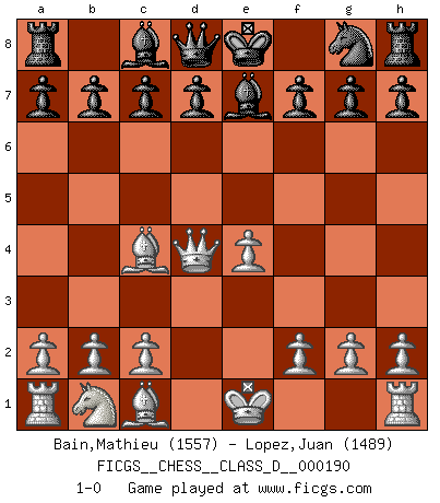 Last move : 1-0 2013 March 9 5:19:42 [Event "FICGS__CHESS__CLASS_D__000190"] [Site "FICGS"] [Date "2013.01.22"] [Round "1"] [White "Bain,Mathieu"] [Black "Lopez,Juan"] [Result "1-0"] [WhiteElo "1557"] [BlackElo "1489"] 1.e4 e5 2.Nf3 Nc6 3.Bc4 Be7 4.d4 exd4 5.Nxd4 Nxd4 6.Qxd4 1-0 This chess game has been lost on time (started : 2013.01.22 12:27:15) Hungarian defense Player White won this chess game. Follow this game move after move (download)On the chessboard, lies and hypocrisy do not survive long. (Emanuel Lasker) Wer mein Gambit spielt, muß bereit sein, alle Brücken hinter sich abzubrechen. Es verändert den ganzen Menschen. Es wirkt wie ein Zauberstab und fördert verkümmerte, gute Charakter- eigenschaften wieder zu Tage. (Emil Joseph Diemer) A la fecha, Fischer esta simplemente un nivel arriba de todos los mejores jugadores de Ajedrez del mundo. (John Jacobs) En blitz, le Cavalier l'emporte sur le Fou. (Vlastimil Hort) Warrior pose battles inner weakness and wins focus. You see that there is no war within you. You're on your own side, and you are your own strength. (Terri Guillemets)