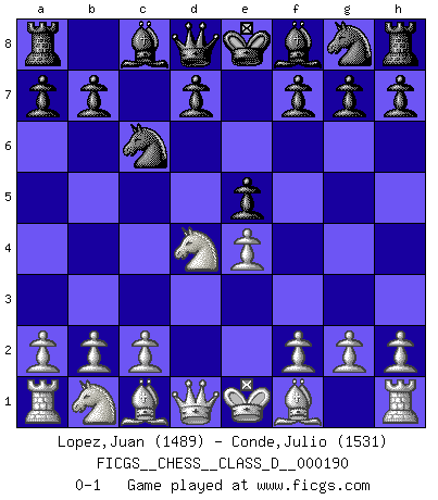 Last move : 0-1 2013 March 8 17:17:27 [Event "FICGS__CHESS__CLASS_D__000190"] [Site "FICGS"] [Date "2013.01.22"] [Round "1"] [White "Lopez,Juan"] [Black "Conde,Julio"] [Result "0-1"] [WhiteElo "1489"] [BlackElo "1531"] 1.e4 c5 2.Nf3 Nc6 3.d4 cxd4 4.Nxd4 e5 0-1 This chess game has been lost on time (started : 2013.01.22 12:27:15) Sicilian : Labourdonnais-Loewenthal variation Player Black won this chess game. Follow this game move after move (download)The only thing Chess players have in common is Chess. (Lodewijk Prins) Garry Kasparov war erst in der Großmeister-Organisation GMA, dann in der Profischach-Vereinigung PCA, zum Schluss kehrte er wieder in den Schoß der FIDE zurück. Aber gut, manche Leute sind flexibel (Viswanathan Anand) Por la belleza de sus partidas, la claridad de su juego y lo brillante de sus ideas, Fischer se creó el mismo como un artista de la misma estatura como Brahms, Rembrandt y Shakespeare. (David Levy) Ce n'est pas pour s'amuser qu'il joue aux échecs : il célèbre un culte. (Vladimir Nabokov) The greatest con, that he ever pulled... was making you believe... that he is you. (Revolver, movie)