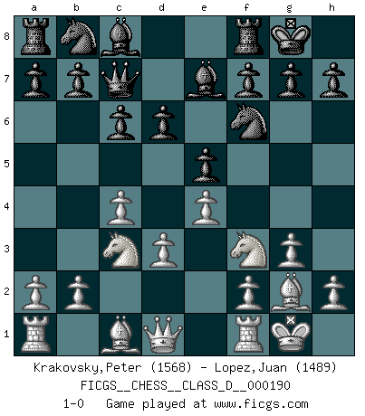 Last move : 1-0 2013 March 5 17:1:57 [Event "FICGS__CHESS__CLASS_D__000190"] [Site "FICGS"] [Date "2013.01.22"] [Round "1"] [White "Krakovsky,Peter"] [Black "Lopez,Juan"] [Result "1-0"] [WhiteElo "1568"] [BlackElo "1489"] 1.c4 Nf6 2.g3 e5 3.Bg2 Be7 4.Nc3 O-O 5.d3 c6 6.Nf3 Qc7 7.e4 d6 8.O-O 1-0 This chess game has been lost on time (started : 2013.01.22 12:27:15) English, 1...Nf6 (Anglo-Indian defense) Kingside Castling by player Black (move 4) Kingside Castling by player White (move 8) Player White won this chess game. Follow this game move after move (download)Of Chess it has been said that life is not long enough for it, but that is the fault of life, not Chess. (William Ewart Napier) Ich kenne Menschen, die allen Willen der Welt besitzen und doch nicht Schach spielen können. (Robert James Fischer) Yo adoro todas la posiciones. Denme una partida posicional difícil, y la jugaré. Pero posiciones totalmente ganadas, no las tolero. (Hein Donner) Votre prénom est 'Tactique', votre deuxième prénom est 'Tactique' et votre nom est 'Tactique'. (Ken Smith) To send light into the darkness of men's hearts - such is the duty of the artist. (Schumann)