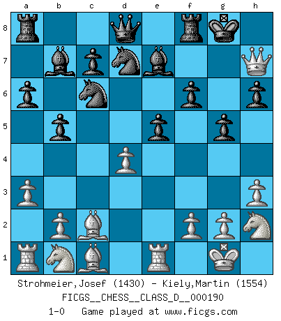 Last move : 1-0 2013 February 11 20:40:44 [Event "FICGS__CHESS__CLASS_D__000190"] [Site "FICGS"] [Date "2013.01.22"] [Round "1"] [White "Strohmeier,Josef"] [Black "Kiely,Martin"] [Result "1-0"] [WhiteElo "1430"] [BlackElo "1554"] 1.e4 e5 2.Nf3 Nc6 3.Bb5 a6 4.Ba4 Nf6 5.O-O Be7 6.Re1 O-O 7.c3 b5 8.Bc2 d6 9.h3 Bb7 10.d4 exd4 11.cxd4 h6 12.a3 g5 13.Nh2 Nd7 14.Qd3 f6 15.e5 dxe5 16.Qh7+ 1-0 Ruy Lopez : Closed defense Kingside Castling by player White (move 5) Kingside Castling by player Black (move 6) Player White won this chess game. Follow this game move after move (download)Chess is a beautiful mistress. (Bent Larsen) Ein Kibitz ist einer, der deinem Gegner gute Ratschläge gibt. (Andrew Soltis) ¿Que sería del Ajedrez sin errores graciosos?. (Kurt Richter) La victoire dans une partie d'Echecs appartient la plupart du temps à celui qui voit un peu plus loin que l'adversaire. (Lasker) Luck has a peculiar habit of favoring those who don't depend on it. (Author unknown)