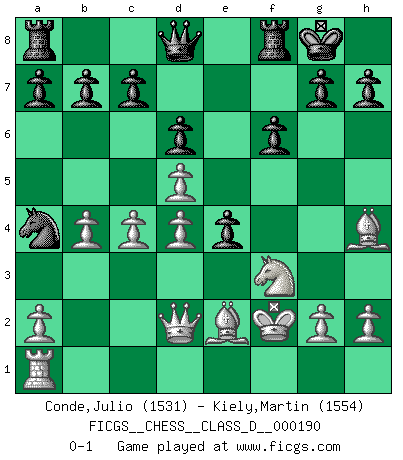 Last move : 0-1 2013 April 17 22:27:8 [Event "FICGS__CHESS__CLASS_D__000190"] [Site "FICGS"] [Date "2013.01.22"] [Round "1"] [White "Conde,Julio"] [Black "Kiely,Martin"] [Result "0-1"] [WhiteElo "1531"] [BlackElo "1554"] 1.e4 e5 2.Nf3 Nc6 3.b3 Nf6 4.d3 Bc5 5.Be2 Ng4 6.O-O Nxf2 7.Rxf2 Bxf2+ 8.Kxf2 O-O 9.Bg5 f6 10.Bh4 d6 11.Nc3 Be6 12.Nd5 Bxd5 13.exd5 Nb4 14.c4 Na6 15.Qd2 Nc5 16.b4 Na4 17.d4 e4 0-1 King's pawn game Kingside Castling by player White (move 6) Kingside Castling by player Black (move 8) Player Black won this chess game. Follow this game move after move (download)Chess teaches you to control the initial excitement you feel when you see something that looks good and it trains you to think objectively when you're in trouble. (Stanley Kubrick) Capablanka war das größte Genie der Schachgeschichte! Aber denken sie nicht er habe nichts vom Schach verstanden. Er wusste nur soviel wie er wissen musste um seine Ziele zu erreichen. (Mikhail Moiseyevich Botvinik) Yo he agregado estos principios a la ley: pongan los Caballos en acción antes de que los dos Alfiles sean desarrollados. (Emanuel Lasker) L'action d'une oeuvre littéraire se déroule sur un champ de bataille. Les masques et les types du drame moderne correspondent aux pièces du jeu d'échecs. L'intrigue correspond aux coups et aux gambits, c'est à dire aux techniques du jeu telles qu'utilisées et interprétées par les joueurs. Les tactiques et les péripéties [mouvements] correspondent aux coups exécutés par l'adversaire. (Viktor Shklovsky) All maxims have their antagonist maxims; proverbs should be sold in pairs, a single one being but a half truth. (William Mathews)