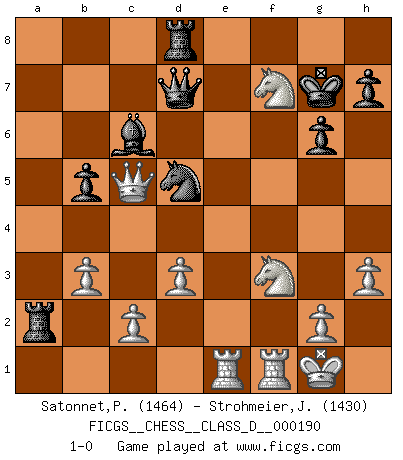 Last move : 1-0 2013 May 14 22:57:31 [Event "FICGS__CHESS__CLASS_D__000190"] [Site "FICGS"] [Date "2013.01.22"] [Round "1"] [White "Satonnet,Patrick"] [Black "Strohmeier,Josef"] [Result "1-0"] [WhiteElo "1464"] [BlackElo "1430"] 1.e4 c5 2.f4 g6 3.Nf3 Bg7 4.Nc3 Nc6 5.Bb5 d6 6.O-O Bd7 7.Bxc6 Bxc6 8.d3 Qd7 9.Bd2 b5 10.Qe2 Nf6 11.Rae1 O-O 12.e5 Ne8 13.Ne4 Nc7 14.b3 a5 15.Qf2 a4 16.h3 axb3 17.axb3 Ra2 18.exd6 exd6 19.Bc3 Nd5 20.Bxg7 Kxg7 21.f5 Qxf5 22.Nxd6 Qd7 23.Qxc5 Rd8 24.Nxf7 1-0 Sicilian : Grand Prix attack Kingside Castling by player White (move 6) Kingside Castling by player Black (move 11) Player White won this chess game. Follow this game move after move (download)Every Chess master was once a beginner. (Chernev) Sie bekommen vielleicht den Eindruck, dass die Spitzenspieler überhaupt gar nicht so stark sind. Aber das stimmt nicht. Es ist eine Illusion. Mit einem Computer an der Seite ist es sehr leicht, Urteile zu fällen, aber wenn man alleine am Brett sitzt, sieht die Sache ganz anders aus. (Vladimir Kramnik) Debió haber existido una vez en que los hombres eran semidióses, de otra manera no hubiesen podido inventar el Ajedrez. (Gustav Schenk) Les erreurs sont comme les malheurs, elles n'arrivent jamais seules. (Siegbert Tarrasch) They misunderestimated me. (George W. Bush, Bentonville nov. 6, 2000)
