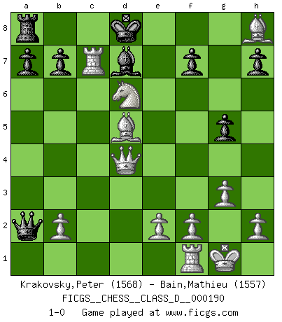 Last move : 1-0 2013 April 9 13:53:18 [Event "FICGS__CHESS__CLASS_D__000190"] [Site "FICGS"] [Date "2013.01.22"] [Round "1"] [White "Krakovsky,Peter"] [Black "Bain,Mathieu"] [Result "1-0"] [WhiteElo "1568"] [BlackElo "1557"] 1.c4 e5 2.Nc3 Nf6 3.Nf3 Nc6 4.g3 Bc5 5.Bg2 e4 6.Nh4 Qe7 7.O-O g5 8.d4 Bxd4 9.Nf5 Qc5 10.Nxd4 Nxd4 11.Be3 Qxc4 12.Bxd4 Nd5 13.Bxh8 Nb4 14.Nxe4 Nd5 15.Rc1 Qxa2 16.Qd4 d6 17.Rxc7 Bd7 18.Nxd6+ Kd8 19.Bxd5 1-0 English Opening Kingside Castling by player White (move 7) Player White won this chess game. Follow this game move after move (download)It is the aim of the modern school, not to treat every position according to one general law, but according to the principle inherent in the position. (Richard Reti) Ich möchte Schüler heranbilden, die das Vermögen haben, selbst zu denken und Kritik zu üben. (Emanuel Lasker) Las ideas audaces son como las piezas del Ajedrez que avanzan hacia adelante. Ellas pueden ser vencidas, pero también pueden iniciar una partida victoriosa. (Goethe) Psychologiquement, tu dois avoir confiance en toi même, mais cette confiance doit être basée sur des faits. (Robert Fischer) I can't decide which is riskier; taking crazy risks, or taking advice on crazy risks from a crazy risk taker. (Gregory House in House M.D.)