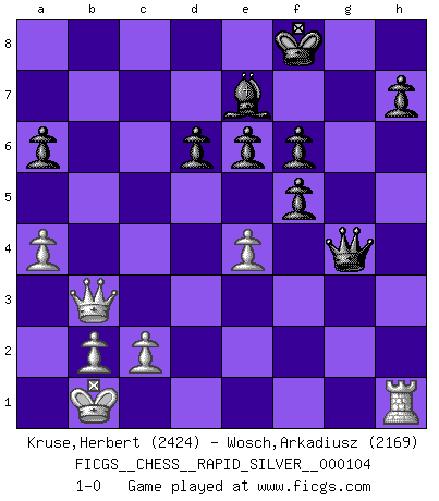 Last move : 1-0 2013 April 6 7:23:51 [Event "FICGS__CHESS__RAPID_SILVER__000104"] [Site "FICGS"] [Date "2013.01.22"] [Round "1"] [White "Kruse,Herbert"] [Black "Wosch,Arkadiusz"] [Result "1-0"] [WhiteElo "2424"] [BlackElo "2169"] 1.e4 c5 2.Nf3 Nc6 3.d4 cxd4 4.Nxd4 Nf6 5.Nc3 d6 6.Bg5 e6 7.Qd2 a6 8.Nxc6 bxc6 9.O-O-O Be7 10.Bxf6 gxf6 11.Bc4 Rb8 12.Rhe1 Qb6 13.Bb3 Rg8 14.f4 c5 15.Qe2 Kf8 16.a4 c4 17.Qxc4 Rxg2 18.f5 Qc5 19.Qd3 Qe5 20.Rg1 Qxh2 21.Rxg2 Qxg2 22.Kb1 Rb4 23.Qe3 exf5 24.Nd5 Rb7 25.Qc3 Be6 26.Nf4 Rxb3 27.Nxe6+ fxe6 28.Qxb3 Qg4 29.Rh1 1-0 Sicilian defense Queenside Castling by player White (move 9) Player White won this chess game. Follow this game move after move (download)Spassky will not be psyched out by Fischer. (Mike Goodall) Ich war schon mal beim Dopingtest. Da musste ich Urin abgeben, während Dritte zusahen. (Elisabeth Pähtz) El Ajedrez es una guerra en un tablero. El objetivo es aplastar la mente del oponente. (Bobby Fischer) On entre au jeu d'Echecs comme on entre en Religion. Pour le joueur d'Echecs, la partie d'Echecs c'est l'office, la messe, le défilé du 1er Mai, le dépôt de gerbe au Monument aux Morts. C'est un drame sacré. (Michel Roos) To err is human, but to really foul things up requires a computer. (Farmer's Almanac, 1978)