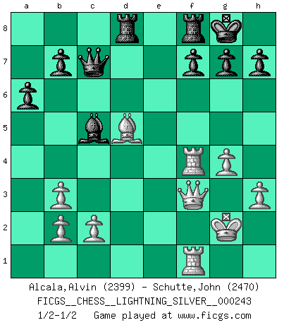 Last move : 1/2-1/2 2013 January 23 17:1:58 [Event "FICGS__CHESS__LIGHTNING_SILVER__000243"] [Site "FICGS"] [Date "2013.01.23"] [Round "1"] [White "Alcala,Alvin"] [Black "Schutte,John"] [Result "1/2-1/2"] [WhiteElo "2399"] [BlackElo "2470"] 1.e4 c5 2.Nf3 d6 3.d4 cxd4 4.Nxd4 Nf6 5.Nc3 a6 6.Be3 e5 7.Nb3 Be6 8.h3 Be7 9.f4 Nc6 10.f5 Bxb3 11.axb3 Nb4 12.g3 Qc8 13.Bg2 d5 14.exd5 Qxf5 15.Rc1 e4 16.g4 Qd7 17.Bd4 O-O 18.O-O Nfxd5 19.Bxe4 Bg5 20.Ra1 Ne3 21.Bxe3 Bxe3+ 22.Kg2 Qc7 23.Qf3 Ba7 24.Ra4 Bc5 25.Nd5 Nxd5 26.Bxd5 Rad8 27.Rf4 1/2-1/2 Sicilian : Najdorf, Byrne (English) attack Kingside Castling by player Black (move 17) Kingside Castling by player White (move 18) This chess game ended in a draw. Follow this game move after move (download)Fischer was a master of clarity and a king of artful positioning. His opponents would see where he was going but were powerless to stop him. (Bruce Pandolfini) Ein Buch ist ein Spiegel; wenn ein Affe hineinsieht, so kann kein Apostel heraus gucken. (Georg Christoph Lichtenberg) El Ajedrez es en su esencia, un juego. En su forma, un arte. Y en su ejecución, una ciencia. (Baron Tassilo) Comme les marins qui ont mille raisons différentes d'aller en mer, les joueurs d'échecs en ont tout autant avant de s'installer devant une table et jouer... (Vincent Bertignac, philosophe) Difficult things take a long time, impossible things a little longer. (Author unknown)