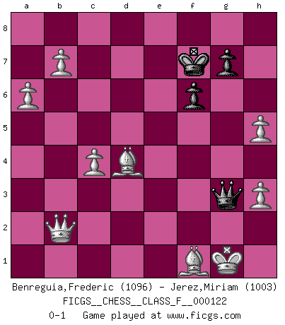 Last move : 0-1 2014 January 4 10:29:29 [Event "FICGS__CHESS__CLASS_F__000122"] [Site "FICGS"] [Date "2013.01.24"] [Round "1"] [White "Benreguia,Frederic"] [Black "Jerez,Miriam"] [Result "0-1"] [WhiteElo "1096"] [BlackElo "1003"] 1.b4 a6 2.g3 d5 3.a3 b5 4.Bg2 c6 5.d4 Nf6 6.e3 Bg4 7.Ne2 e6 8.O-O Bd6 9.f3 Bh5 10.g4 Bg6 11.h3 O-O 12.f4 h6 13.Nbc3 Ne4 14.Nxe4 dxe4 15.Nc3 Re8 16.Nxe4 Qh4 17.Nxd6 Rd8 18.f5 exf5 19.Nxf5 Bxf5 20.Rxf5 Ra7 21.e4 Nd7 22.e5 a5 23.Bb2 Nxe5 24.Rxe5 f6 25.Re6 Rc7 26.bxa5 c5 27.a4 b4 28.Qe2 cxd4 29.Rd1 Qg3 30.Rxd4 Rxd4 31.Bxd4 b3 32.c3 Rb7 33.c4 Rb8 34.Rb6 Rxb6 35.axb6 Kh7 36.a5 Kg6 37.b7 Kf7 38.a6 b2 39.Qxb2 h5 40.gxh5 Qe1+ 41.Bf1 Qg3+ 0-1 This chess game has been lost on time (started : 2013.01.24 2:6:29) Polish (Sokolsky) opening Kingside Castling by player White (move 8) Kingside Castling by player Black (move 11) Player Black won this chess game. Follow this game move after move (download)The King is a fighting piece. Use it ! (Wilhelm Steinitz) Ich hatte Zahnschmerzen im ersten Spiel. In der zweiten Partie tat mir der Kopf weh. In der dritten war es eine Rheuma-Attacke und während der vierten fühlte ich mich nicht gut. Und in der fünften? Nun, man muss doch nicht jedes Spiel gewinnen, oder? (Savielly Grigorievitsch Tartakower) Me siento como si fuera una pieza en una partida de Ajedrez, cuando mi oponente me indica: esa pieza no puede ser movida. (Soren Kierkegaard) Le génie consiste à savoir transgresser les règles au moment opportun. (Teichmann) Gambling is the son of avarice and the father of despair. (French proverb)
