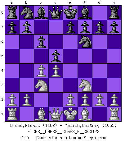 Last move : 1-0 2013 March 6 17:1:40 [Event "FICGS__CHESS__CLASS_F__000122"] [Site "FICGS"] [Date "2013.01.24"] [Round "1"] [White "Bromo,Alexis"] [Black "Malish,Dmitriy"] [Result "1-0"] [WhiteElo "1182"] [BlackElo "1063"] 1.d4 d5 2.c4 c6 3.Nc3 Nf6 4.Nf3 1-0 This chess game has been lost on time (started : 2013.01.24 2:6:29) QGD Slav defense Player White won this chess game. Follow this game move after move (download)The older I grow, the more I value pawns. (Paul Keres) Bobby Fischer ist kein Vorbild für die heutige Jugend. (Viktor Kortschnoi) Fischer no está bajo la obligación de nadie. (Joseph Platz) Botvinnik disait en comparant les échecs à la musique: Il existe une science dont le but est l'étude de l'acoustique et des sons. Mais il y a aussi un art qui se sert de l'océan des sons : c'est la musique. De toute évidence, il en est de même pour la pensée. La logique est l'étude des lois de la réflexion et les échecs reflètent, en tant qu'art, le côté logique de la réflexion, sous la forme d'images artistiques... Extrait de Fischer - Spassky, Reykjavik 1972 par Alexander & F. Wyndham (Ed. Solar), p 37. Programmer - an organism that turns coffee into software. (Anonymous)