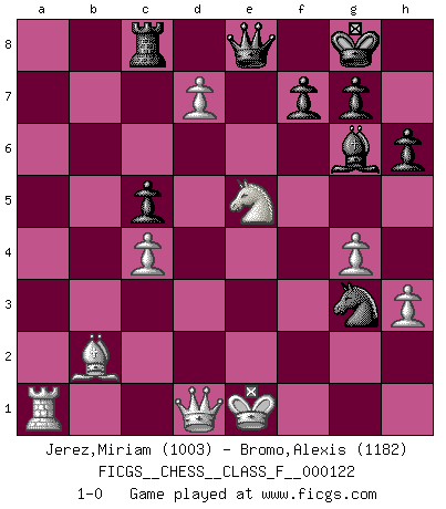 Last move : 1-0 2013 March 18 6:24:56 [Event "FICGS__CHESS__CLASS_F__000122"] [Site "FICGS"] [Date "2013.01.24"] [Round "1"] [White "Jerez,Miriam"] [Black "Bromo,Alexis"] [Result "1-0"] [WhiteElo "1003"] [BlackElo "1182"] 1.e4 e5 2.Nf3 Nc6 3.Bc4 h6 4.O-O Nf6 5.d4 d6 6.d5 Nb4 7.Nc3 Bg4 8.Be2 a6 9.Re1 Be7 10.a3 Nbxd5 11.exd5 O-O 12.h3 Bf5 13.b4 b5 14.Bb2 Rc8 15.a4 c5 16.bxc5 dxc5 17.axb5 axb5 18.Bxb5 e4 19.Nxe4 Nxe4 20.c4 Re8 21.Bxe8 Qxe8 22.g4 Bg6 23.Ne5 Bh4 24.d6 Bxf2+ 25.Kf1 Bxe1 26.d7 Ng3+ 27.Kxe1 1-0 King's pawn game Kingside Castling by player White (move 4) Kingside Castling by player Black (move 11) Player White won this chess game. Follow this game move after move (download)Fischer is the strongest player in the world. In fact, the strongest player who ever lived. (Larry Evans) Im Reiche der Wirklichkeit ist man nie so glücklich wie im Reiche der Gedanken. (Arthur Schopenhauer) Hoy en día, si tu no eres un Gran Maestro a los 14 años, es mejor que lo olvides. (Anand Viswanathan) La vérité est comme le meilleur coup aux échecs : elle existe, mais il faut la chercher. (Arturo Perez-Reverte) Either move or be moved. (Ezra Pound)