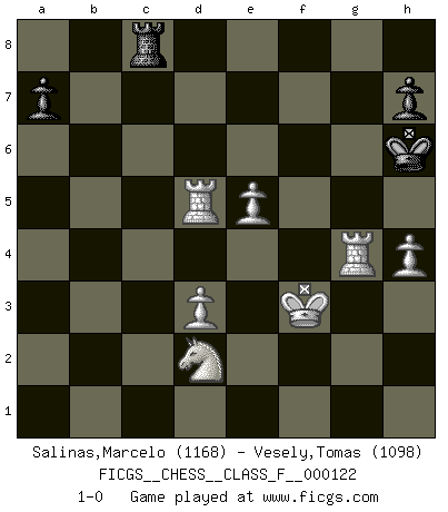 Last move : 1-0 2013 March 16 13:1:36 [Event "FICGS__CHESS__CLASS_F__000122"] [Site "FICGS"] [Date "2013.01.24"] [Round "1"] [White "Salinas,Marcelo"] [Black "Vesely,Tomas"] [Result "1-0"] [WhiteElo "1168"] [BlackElo "1098"] 1.d3 e5 2.e4 c5 3.Qh5 Nc6 4.Bg5 Be7 5.Nf3 g6 6.Bxe7 Qxe7 7.Qh3 d5 8.g4 d4 9.Qg3 Nb4 10.Na3 f6 11.c3 Nc6 12.cxd4 cxd4 13.Nc2 Nb4 14.Nxb4 Qxb4+ 15.Nd2 Be6 16.f4 Qxb2 17.Rb1 Qxa2 18.fxe5 Rc8 19.exf6 Nxf6 20.Qe5 Kf7 21.Rxb7+ Bd7 22.g5 Qe6 23.Qxf6+ Qxf6 24.gxf6 Ke6 25.Bh3+ Kxf6 26.Rf1+ Kg5 27.Rxd7 Rc3 28.Rd5+ Kh4 29.Bg2 Rc1+ 30.Kf2 Rc2 31.Rd1 Rf8+ 32.Ke2 g5 33.Rxd4 Rf4 34.Rd6 Kh5 35.Bf3+ g4 36.Rd5+ Kg6 37.Rg1 Rxf3 38.Rxg4+ Kh6 39.Kxf3 Rc6 40.e5 Rc8 41.h4 1-0 Mieses Opening Player White won this chess game. Follow this game move after move (download)Pawns are born free, yet they are everywhere in chains. (Rick Kennedy) Im Schach gibt es keinen Platz für Galanterie. (Irving Chernev) Durante una competencia de Ajedrez, un Maestro de Ajedrez deberá ser una combinación de presa de caza y un Monge. (Alexander Alekhine) Nous sommes les pions de la mystérieuse partie d'Echecs jouée par Dieu. Il nous déplace, nous arrête, nous pousse encore, puis nous lance un à un dans la boîte du Néant. Epitaphe sur la tombe de David Janowsky (1868-1927). In God we trust, all others we virus scan. (Anonymous)
