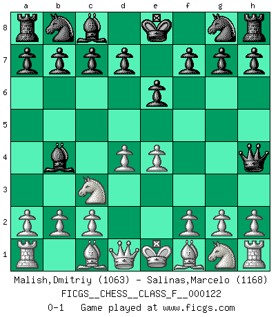 Last move : 0-1 2013 March 11 17:31:44 [Event "FICGS__CHESS__CLASS_F__000122"] [Site "FICGS"] [Date "2013.01.24"] [Round "1"] [White "Malish,Dmitriy"] [Black "Salinas,Marcelo"] [Result "0-1"] [WhiteElo "1063"] [BlackElo "1168"] 1.e4 e6 2.d4 Qh4 3.Nc3 Bb4 0-1 This chess game has been lost on time (started : 2013.01.24 2:6:29) French defense Player Black won this chess game. Follow this game move after move (download)All I want to do, ever, is just play Chess. (Bobby Fischer) Es macht mich traurig, wenn ich sehe, dass Golfprofis mehr verdienen als Schachsportler. Obwohl ich davon überzeugt bin, dass wir Schachspieler viel härter trainieren müssen als die Golfer. (Alexandra Kosteniuk) El Ajedrez es un regaderazo frío para la mente. (Sir John Simon) On a dit que l'homme se distingue de l'animal par le fait qu'il achète plus de livres qu'il ne peut en lire. Je voudrais suggérer qu'inclure à la liste des livres quelques livres d'échecs rendrait la distinction manifeste. (Edward Lasker) Depression is just anger without enthusiasm. (Unknown)