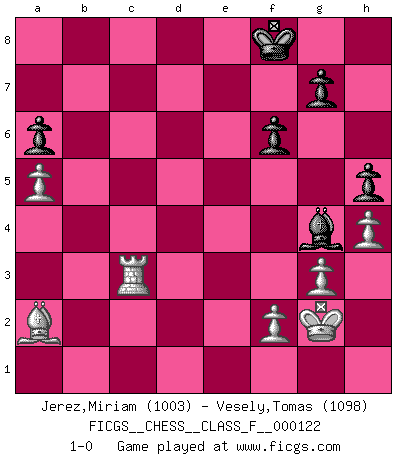Last move : 1-0 2013 July 21 3:47:44 [Event "FICGS__CHESS__CLASS_F__000122"] [Site "FICGS"] [Date "2013.01.24"] [Round "1"] [White "Jerez,Miriam"] [Black "Vesely,Tomas"] [Result "1-0"] [WhiteElo "1003"] [BlackElo "1098"] 1.e4 e5 2.Nf3 d5 3.d3 Nc6 4.c3 d4 5.cxd4 Nxd4 6.Nxe5 Qf6 7.Qa4+ Nc6 8.Nxc6 Qxc6 9.Qxc6+ bxc6 10.g3 Nf6 11.Nc3 Ba6 12.Be2 Bb4 13.O-O O-O 14.Bd2 Rab8 15.e5 Nd5 16.Nxd5 Bxd2 17.Nxc7 Bb7 18.Rfd1 Ba5 19.d4 Bxc7 20.b4 Rbd8 21.a4 Bb6 22.Rac1 Bxd4 23.Bc4 Bxe5 24.Rxd8 Rxd8 25.h4 Bc8 26.b5 cxb5 27.Bxb5 a6 28.Bc6 Bg4 29.Re1 f6 30.Kg2 Rd2 31.a5 Ra2 32.Bd5+ Kf8 33.Bxa2 Bc3 34.Rc1 h5 35.Rxc3 1-0 QP counter-gambit (elephant gambit) Kingside Castling by player White (move 13) Kingside Castling by player Black (move 13) Player White won this chess game. Follow this game move after move (download)Chess opens and enriches your mind. (Saudin Robovic) Ich kämpfe solange mein Gegner einen Fehler machen kann. (Emanuel Lasker) El ganar no lo es todo... pero el perder es nada. (Mednis) C'est une question de caractère, Beaucoup de gens perdent leur motivation très vite. D'autres, ils sont rares, peuvent la conserver très longtemps. J'aime les échecs, encore aujourd'hui je suis heureux d'analyser des parties. J'aime toujours gagner, je déteste encore perdre. Bien jouer est important pour mon intégrité intellectuelle et morale. Et puis les échecs vivent en ce moment une période historique grâce à Internet. Ils se développent dans les systèmes éducatifs à travers le monde. Ils sortent de leur ghetto, et c'est mon rôle de mener à bien cette révolution. (Gary Kasparov) Rules and bones are meant to be broken. (Anonymous)