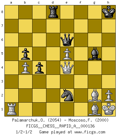 Last move : 1/2-1/2 2013 April 8 17:17:25 [Event "FICGS__CHESS__RAPID_A__000136"] [Site "FICGS"] [Date "2013.01.24"] [Round "1"] [White "Palamarchuk,Oleg"] [Black "Moscoso,Fernando"] [Result "1/2-1/2"] [WhiteElo "2054"] [BlackElo "2000"] 1.e4 e5 2.Nf3 Nc6 3.Bb5 a6 4.Ba4 Nf6 5.O-O Nxe4 6.d4 b5 7.Bb3 d5 8.dxe5 Be6 9.Nbd2 Be7 10.c3 O-O 11.Bc2 f5 12.Nb3 Qd7 13.Nfd4 Nxd4 14.Nxd4 c5 15.Nxe6 Qxe6 16.f3 Ng5 17.Kh1 Rad8 18.a4 Qb6 19.Be3 Ne6 20.Qb1 g6 21.b4 d4 22.cxd4 c4 23.axb5 axb5 24.g4 fxg4 25.Bxg6 Bg5 26.Bxh7+ Kh8 27.Bg1 Nxd4 28.Be4 gxf3 29.Rxf3 Rxf3 30.Bxf3 Qe6 31.Bg2 Ne2 32.Qe4 1/2-1/2 Ruy Lopez : Open, 7.Bb3 Kingside Castling by player White (move 5) Kingside Castling by player Black (move 10) This chess game ended in a draw. Follow this game move after move (download)Bobby Fischer is the greatest Chess player who has ever lived. (Ken Smith) Ich habe Putins Aufstieg an die Macht beobachtet und seine Politik, die demokratischen Institutionen meines Landes zu zerstören. (Garry Kasparov) En partidas rápidas, el Caballo es mas poderoso que el Alfil. (Vlastimil Hort) Votre seul travail dans les ouvertures est d'obtenir un milieu de partie jouable. (Lajos Portish) The hypothalamus is one of the most important parts of the brain, involved in many kinds of motivation, among other functions. The hypothalamus controls the 'Four Fs: Fighting, Fleeing, Feeding and Mating. (Unknown author)
