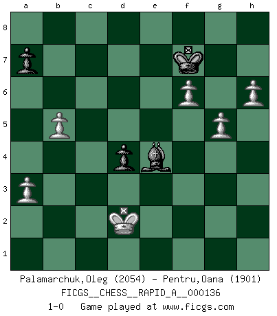 Last move : 1-0 2013 April 24 17:20:31 [Event "FICGS__CHESS__RAPID_A__000136"] [Site "FICGS"] [Date "2013.01.24"] [Round "1"] [White "Palamarchuk,Oleg"] [Black "Pentru,Oana"] [Result "1-0"] [WhiteElo "2054"] [BlackElo "1901"] 1.d4 d5 2.Nf3 Nf6 3.c4 e6 4.e3 c5 5.Nc3 Nc6 6.a3 cxd4 7.exd4 Be7 8.c5 Ne4 9.Qc2 f5 10.Bb5 O-O 11.Bxc6 bxc6 12.O-O Qc7 13.Ne2 Ba6 14.Bf4 Qb7 15.Rfe1 g5 16.Bd6 Nxd6 17.cxd6 Bxd6 18.Nxg5 Rf6 19.Ng3 Re8 20.h4 Qb6 21.Re3 c5 22.Rae1 cxd4 23.Nh5 Rg6 24.Rxe6 R8xe6 25.Nxe6 d3 26.Qd2 Rxe6 27.Rxe6 Bh2+ 28.Kxh2 Qxe6 29.Qg5+ Kf7 30.Qg7+ Ke8 31.Qh8+ Kd7 32.Qxh7+ Kc8 33.Qh8+ Kb7 34.Qg7+ Kb8 35.Nf4 Qe4 36.Qg3 Kb7 37.f3 Qe5 38.Nxd3 Qxg3+ 39.Kxg3 Bxd3 40.Kf4 Bc4 41.Ke5 Kc6 42.h5 f4 43.Kxf4 d4 44.Ke4 Bf7 45.h6 Kc5 46.f4 Bb3 47.Kd3 Be6 48.b4+ Kd5 49.b5 Bf5+ 50.Kd2 Ke6 51.g4 Be4 52.f5+ Kf6 53.g5+ Kf7 54.f6 1-0 Queen's pawn game Kingside Castling by player Black (move 10) Kingside Castling by player White (move 12) 10 pieces endgame at move 43 : White KPPPPP , Black KBPP WHITE : King + 5 Pawns BLACK : King + 1 Bishop 2 Pawns Player White won this chess game. Follow this game move after move (download)If a ruler does not understand Chess, how can he rule over a kingdom ? (King Khusros II) Pläne sind die Träume des Verständigen. (Ernst Freiherr von Feuchtersleben) Yo tuve un dolor de muelas en la primer partida. En el segundo juego, tuve un dolor de cabeza. En el tercero, tuve un ataque de reumatísmo. En la cuarta partida, no me sentía muy bien. ¿Y en el quinto juego? Bueno, ¿que acaso uno tiene que ganar todos los juegos?. (Siegbert Tarrasch) Des points faibles ou des trous dans la position de l'adversaire doivent être occupés par des pièces et non pas par des pions. (Siegbert Tarrasch) When you don't know what to do, walk fast and look worried. (Anonymous)