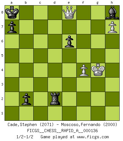 Last move : 1/2-1/2 2013 April 8 15:22:52 [Event "FICGS__CHESS__RAPID_A__000136"] [Site "FICGS"] [Date "2013.01.24"] [Round "1"] [White "Cade,Stephen"] [Black "Moscoso,Fernando"] [Result "1/2-1/2"] [WhiteElo "2071"] [BlackElo "2000"] 1.d4 d5 2.c4 c6 3.Nf3 Nf6 4.Nc3 e6 5.Bg5 dxc4 6.e4 b5 7.e5 h6 8.Bh4 g5 9.Nxg5 hxg5 10.Bxg5 Nbd7 11.g3 Bb7 12.Bg2 Qb6 13.exf6 O-O-O 14.O-O c5 15.d5 b4 16.Na4 Qa6 17.a3 Bxd5 18.Bxd5 Ne5 19.Qe2 Rxd5 20.axb4 cxb4 21.Rfc1 Qc6 22.Bf4 Nd3 23.Rxc4 Qxc4 24.Rc1 Qxc1+ 25.Bxc1 Nxc1 26.Qc4+ Kb7 27.Qxc1 R8h5 28.h4 Rhf5 29.Kg2 Rxf6 30.b3 R6f5 31.Nb2 Bc5 32.f4 Rd4 33.Nc4 Rfd5 34.Qa1 Rxc4 35.bxc4 Rd2+ 36.Kh3 b3 37.Qa5 b2 38.Qb5+ Ka8 39.h5 Bd4 40.c5 Bxc5 41.h6 f5 42.h7 Bd4 43.g4 fxg4+ 44.Kxg4 Bh8 45.Qe8+ 1/2-1/2 QGD Slav : 4.Nc3 Queenside Castling by player Black (move 13) Kingside Castling by player White (move 14) 10 pieces endgame at move 44 : White KQPP , Black KRBPPP WHITE : King + 1 Queen 2 Pawns BLACK : King + 1 Rook 1 Bishop 3 Pawns This chess game ended in a draw. Follow this game move after move (download)Chess is so inspiring that I do not believe a good player is capable of having an evil thought during the game. (Wilhelm Steinitz) Kombinieren und Schwarzhandel gehören verboten. (Savielly Grigorievitsch Tartakower) Una victoria por una combinación errónea, aunque sea espectacular, me llena de horror artístico. (Wilhelm Steinitz) Un millionnaire : 'Monsieur Steinitz ! Vous ne participez aux tournois que pour l'argent, alors que moi je n'y viens que pour l'honneur.' Steinitz : 'Chacun joue pour ce qu'il n'a pas'... It's not a bug - it's an undocumented feature. (Anonymous)