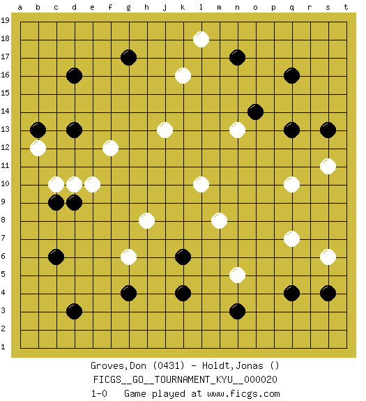 Last move : 1-0 2007 March 20 13:34:29 [Event "FICGS__GO__TOURNAMENT_KYU__000020"] [Site "FICGS"] [Date "2007.01.25"] [Round "1"] [Black "Groves,Don"] [White "Holdt,Jonas"] [Result "1-0"] [Rating 1 "0431"] 1.q4 k16 2.q16 d10 3.d3 g6 4.c6 m8 5.d16 q10 6.k4 q7 7.g4 h8 8.d13 j13 9.g17 l18 10.q13 s11 11.s13 n13 12.n17 n5 13.n3 f12 14.c9 c10 15.d9 e10 16.k6 s6 17.s4 l10 18.o14 b12 19.b13 1-0 This go game has been lost on time (started : 2007.01.25 18:56:11) Here are the names of the openings (joseki) played in the four corners : Corner d4 : d3 g6 Komoku (Somok, Xiao~mu`) 3-4 Point. The komoku (3-4) point is the traditional corner enclosure move.. Corner q4 : q4 m8 Hoshi (Hwajeom, Seongjeom, Xingwei`) 4-4 Point. The star or hoshi (4-4) point, emphasizing influence at the potential expense of territory. Corner q16 : q16 l18 Hoshi (Hwajeom, Seongjeom, Xingwei`) 4-4 Point. The star or hoshi (4-4) point, emphasizing influence at the potential expense of territory. Player Black won this Go (weiqi, baduk) game. Follow this game move after move (download)To invade, need 20 points in open area; otherwise, keshi is best. (Yang Yilun, 7p) When you don't know what to do, walk fast and look worried. (Anonymous)