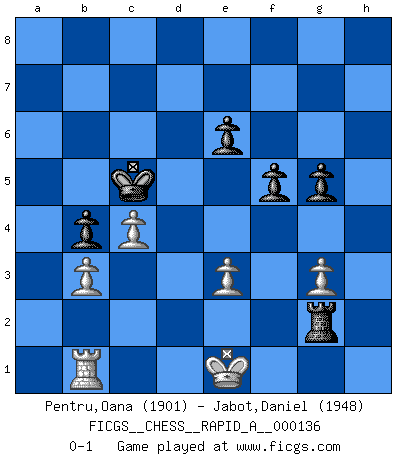 Last move : 0-1 2013 May 11 6:30:16 [Event "FICGS__CHESS__RAPID_A__000136"] [Site "FICGS"] [Date "2013.01.24"] [Round "1"] [White "Pentru,Oana"] [Black "Jabot,Daniel"] [Result "0-1"] [WhiteElo "1901"] [BlackElo "1948"] 1.e4 c5 2.Nf3 d6 3.Bb5+ Bd7 4.Bxd7+ Qxd7 5.O-O Nc6 6.c3 d5 7.exd5 Qxd5 8.d4 e6 9.Be3 cxd4 10.Nxd4 Nf6 11.Nd2 Be7 12.Qb3 O-O 13.Rfe1 Na5 14.Qa4 Rac8 15.Rad1 b6 16.N4f3 Rfd8 17.Bd4 Qb7 18.Bxf6 Bxf6 19.h3 Nc6 20.a3 h6 21.Qg4 Qc7 22.Ne4 Be7 23.Rxd8+ Rxd8 24.Ned2 b5 25.Qe4 a5 26.Qe2 b4 27.axb4 axb4 28.c4 Qf4 29.b3 Nd4 30.Nxd4 Qxd4 31.Nf3 Qc3 32.Rb1 Ra8 33.Kf1 Ra3 34.Qb2 Qd3+ 35.Kg1 Bf6 36.Ne1 Qf5 37.Qc2 Qxc2 38.Nxc2 Bc3 39.Ne3 f5 40.Kf1 Kf7 41.g3 Ke7 42.h4 Kd6 43.Ng2 g5 44.hxg5 hxg5 45.Ne3 Ra2 46.Rd1+ Kc5 47.Rb1 Bd4 48.Ke1 Bxe3 49.fxe3 Rg2 0-1 Sicilian : Canal-Sokolsky attack, 3...Bd7 Kingside Castling by player White (move 5) Kingside Castling by player Black (move 12) Player Black won this chess game. Follow this game move after move (download)Dazzling combinations are for the many, shifting wood is for the few. (Georg Kieninger) Viele Opfer benötigen überhaupt keine konkrete Berechnung. Es genügt sich die entstehende Position kurz vorzustellen, um uns davon zu überzeugen, dass das Opfer korrekt ist. (Mikhail Nekhemyevich Tal) El Ajedrez es un juego de pelea el cual es puramente intelectual e incluye la suerte. (Richard Reti) Il n'y a pas eu de défaite parce que je ne crois pas que cet ordinateur ait jamais existé. IBM a triché en refusant d'imprimer les modes de recherche de la machine. C'est évident, pendant le match, des coups décisifs ont été joués par des êtres humains. Aujourd'hui, les meilleurs spécialistes en informatique ne peuvent toujours pas expliquer comment Deep-Blue a pu jouer contre la logique des ordinateurs. IBM a gagné une guerre de communication, mais ils sont incapables de prouver que l'ordinateur a gagné tout seul. (Garry Kasparov) Life is like internet, nothing interesting, but noone want to leave it. (Ilmars Cirulis)