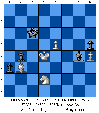 Last move : 1-0 2013 April 28 9:20:48 [Event "FICGS__CHESS__RAPID_A__000136"] [Site "FICGS"] [Date "2013.01.24"] [Round "1"] [White "Cade,Stephen"] [Black "Pentru,Oana"] [Result "1-0"] [WhiteElo "2071"] [BlackElo "1901"] 1.d4 d5 2.c4 e6 3.Nc3 Nf6 4.cxd5 exd5 5.Bg5 Be7 6.e3 O-O 7.Bd3 c6 8.Qc2 Nbd7 9.Nge2 Re8 10.O-O Nf8 11.f3 Be6 12.Rae1 Rc8 13.Kh1 N6d7 14.Bxe7 Qxe7 15.Ng3 Nf6 16.Qf2 c5 17.dxc5 Qxc5 18.Rc1 Qb6 19.Qd2 N8d7 20.Rfd1 Ne5 21.b3 a6 22.Bb1 Qa5 23.Nge2 Rc5 24.Kg1 Rec8 25.Qb2 g6 26.Na4 Rxc1 27.Rxc1 Rxc1+ 28.Qxc1 Nc6 29.Nc5 Nd7 30.Nxd7 Bxd7 31.Qc3 Qxc3 32.Nxc3 Be6 33.Kf2 Kg7 34.e4 d4 35.Ne2 Kf6 36.f4 Ke7 37.Ke1 Kd6 38.Kd2 Kc5 39.h3 h6 40.h4 f6 41.Nc1 Kd6 42.Bd3 Nb4 43.Be2 g5 44.g3 gxh4 45.gxh4 b5 46.Bd3 Nc6 47.Ne2 Kc5 48.Ng3 Nb4 49.Bb1 Bg4 50.a3 Nc6 51.b4+ Kb6 52.Ba2 a5 53.Bd5 axb4 54.Bxc6 bxa3 55.Bd5 Kc5 56.Ba2 Bf3 57.Kd3 Bg2 58.Bf7 b4 59.Bb3 Bf3 60.Nf1 h5 61.Nd2 Bg4 62.e5 fxe5 63.fxe5 Kc6 64.Kxd4 1-0 QGD : Exchange, positional line Kingside Castling by player Black (move 6) Kingside Castling by player White (move 10) 10 pieces endgame at move 64 : White KBNPP , Black KBPPP WHITE : King + 1 Bishop 1 Knight 2 Pawns BLACK : King + 1 Bishop 3 Pawns Player White won this chess game. Follow this game move after move (download)Openings teach you openings. Endgames teach you chess ! (Stephan Gerzadowicz) Moralische Siege zählen nicht. (Savielly Grigorievitsch Tartakower) El Ajedrez no es una pizca de inferior al violín, y tenemos un gran número de violinistas profesionales. (Mikhail Botvinnik) Si je n'étais pas joueur d'échecs, je serais le meilleur dans quelque chose d'autre. (Anatoli Karpov) God, you are such an idiot. - Actually, I thought I was more of a jerk. (Gregory House to Stacy Warner, House M.D.)