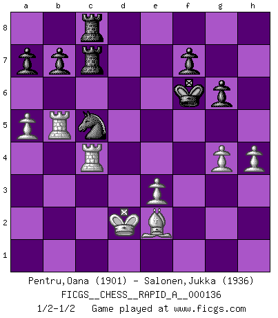 Last move : 1/2-1/2 2013 February 23 10:26:30 [Event "FICGS__CHESS__RAPID_A__000136"] [Site "FICGS"] [Date "2013.01.24"] [Round "1"] [White "Pentru,Oana"] [Black "Salonen,Jukka"] [Result "1/2-1/2"] [WhiteElo "1901"] [BlackElo "1936"] 1.d4 d5 2.c4 e6 3.Nc3 Nf6 4.Nf3 Bb4 5.Bg5 h6 6.Bxf6 Qxf6 7.e3 O-O 8.Qb3 c5 9.cxd5 exd5 10.dxc5 Bxc3+ 11.Qxc3 Qxc3+ 12.bxc3 Be6 13.Nd4 Rc8 14.Kd2 Nd7 15.Be2 Nxc5 16.f3 Rc7 17.Rab1 Rac8 18.Rhc1 g6 19.h4 h5 20.a4 Kg7 21.Nb5 Bf5 22.Rb2 Re7 23.a5 Kf6 24.Nd4 Rce8 25.Rb5 Rc7 26.c4 dxc4 27.Rxc4 Rec8 28.Nxf5 Kxf5 29.g4+ hxg4 30.fxg4+ Kf6 1/2-1/2 QGD : Ragozin variation Kingside Castling by player Black (move 7) This chess game ended in a draw. Follow this game move after move (download)I'd rather have a Pawn than a finger. (Reuben Fine) Ich habe die besten Aussichten, den ersten Preis zu gewinnen - denn jeder muss gegen Steinitz spielen, nur ich nicht! (Wilhelm Steinitz) El estómago es una parte esencial del maestro de Ajedrez. (Bent Larsen) L'attaque fait le spectacle, la défense gagne les matchs. (Dicton footballistique) Always be a first-rate version of yourself, instead of a second-rate version of somebody else. (Judy Garland)