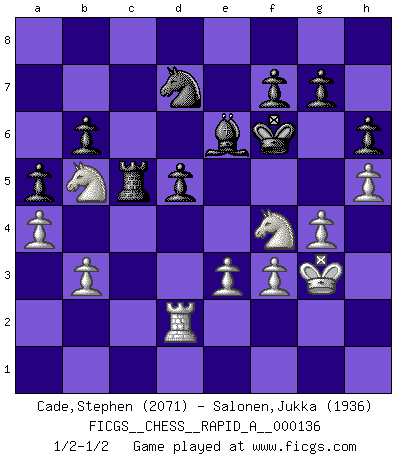 Last move : 1/2-1/2 2013 March 1 11:40:19 [Event "FICGS__CHESS__RAPID_A__000136"] [Site "FICGS"] [Date "2013.01.24"] [Round "1"] [White "Cade,Stephen"] [Black "Salonen,Jukka"] [Result "1/2-1/2"] [WhiteElo "2071"] [BlackElo "1936"] 1.d4 d5 2.c4 e6 3.Nc3 Nf6 4.cxd5 exd5 5.Bg5 Be7 6.e3 O-O 7.Bd3 c5 8.dxc5 Nbd7 9.Nge2 Nxc5 10.O-O Be6 11.Bc2 Qb6 12.Qd4 h6 13.Bh4 Rfc8 14.Rfd1 Kf8 15.Rab1 Nce4 16.Bxe4 Qxd4 17.Nxd4 Nxe4 18.Bxe7+ Kxe7 19.Nce2 Nd6 20.f3 Nc4 21.Kf2 Rc5 22.h4 Rac8 23.h5 Kf6 24.g4 Ra5 25.b3 Ne5 26.a4 Rac5 27.Rd2 b6 28.Nf4 a5 29.Rbd1 Rc1 30.Rxc1 Rxc1 31.Nb5 Rc5 32.Kg3 Nd7 1/2-1/2 QGD : Exchange, positional line Kingside Castling by player Black (move 6) Kingside Castling by player White (move 10) This chess game ended in a draw. Follow this game move after move (download)I played Chess with him and would have beaten him sometimes only he always took back his last move, and ran the game out differently. (Mark Twain) Gewöhnliche Menschen denken nur daran, wie sie ihre Zeit verbringen. Ein intelligenter Mensch versucht, sie auszunutzen. (Arthur Schopenhauer) ¿Se han dado cuenta de que Fischer casi nunca ha tenido piezas malas? El las intercambia y las piezas malas se quedan con sus oponenets. (Yuri Balashov) Celui qui prend des risques peut perdre, celui qui n'en prend pas perd toujours. (Xavier Tartacover) It's not the will to win, but the will to prepare to win that makes the difference. (Bear Bryant)