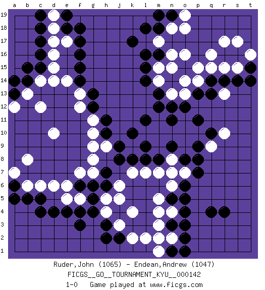 Last move : 1-0 2013 April 30 19:36:7 [Event "FICGS__GO__TOURNAMENT_KYU__000142"] [Site "FICGS"] [Date "2013.01.24"] [Round "1"] [Black "Ruder,John"] [White "Endean,Andrew"] [Result "1-0"] [Rating 1 "1065"] [Rating 2 "1047"] 1.q4 d16 2.d4 q16 3.r14 r15 4.q14 o16 5.q10 d10 6.f17 e17 7.f16 d14 8.k17 m17 9.l15 m15 10.l14 m14 11.m13 n13 12.n12 o13 13.o12 p14 14.p13 p15 15.n14 o14 16.m16 n15 17.l16 n16 18.s14 s15 19.c15 d15 20.c17 d17 21.c16 c14 22.b14 b13 23.b15 c6 24.f3 k4 25.c4 d6 26.g5 f7 27.h7 g9 28.n3 m5 29.r4 l7 30.k8 k7 31.j8 n8 32.o6 l2 33.j2 m3 34.o3 n2 35.o2 j5 36.h6 j6 37.h10 g10 38.h11 g11 39.g12 f12 40.g13 f13 41.f14 e14 42.f15 m10 43.l11 l10 44.k10 m11 45.m12 o10 46.p11 o11 47.p8 o9 48.m18 n18 49.l18 r17 50.b5 b6 51.a6 a7 52.a5 b8 53.c5 e5 54.t15 t16 55.t14 s17 56.n1 m2 57.c18 d18 58.f18 r13 59.q13 q15 60.a13 a12 61.a14 c12 62.c19 d19 63.l9 m9 64.l8 m7 65.n11 n10 66.m8 n6 67.o8 o7 68.p7 n7 69.o5 h9 70.j9 g8 71.n19 o19 72.m19 o18 73.e4 f5 74.f4 h4 75.h3 j3 76.h2 k2 77.g4 h5 78.f6 e6 79.g6 g7 80.e18 p10 81.p9 q9 82.n9 n4 83.n5 m4 84.o4 m1 85.o1 r10 86.e19 1-0 Here are the names of the openings (joseki) played in the four corners : Corner q16 : q16 r14 Hoshi (Hwajeom, Seongjeom, Xingwei`) 4-4 Point. The star or hoshi (4-4) point, emphasizing influence at the potential expense of territory. Ikken Kakari (Hankan Keolch'im, Yi Gua`jiao~, 1-Space Low Approach). Black 2 is the standard approach move to the 4-4. Corner d16 : d16 f17 Hoshi (Hwajeom, Seongjeom, Xingwei`) 4-4 Point. The star or hoshi (4-4) point, emphasizing influence at the potential expense of territory. Ikken Kakari (Hankan Keolch'im, Yi Gua`jiao~, 1-Space Low Approach). Black 2 is the standard approach move to the 4-4. Corner d4 : d4 c6 Hoshi (Hwajeom, Seongjeom, Xingwei`) 4-4 Point. The star or hoshi (4-4) point, emphasizing influence at the potential expense of territory. Ikken Kakari (Hankan Keolch'im, Yi Gua`jiao~, 1-Space Low Approach). White 2 is the standard approach move to the 4-4. Player Black won this Go (weiqi, baduk) game. Follow this game move after move (download)The weak player fears ko, the strong player seeks it. (Bill Taylor) Computers have lots of memory but no imagination. (Anonymous)
