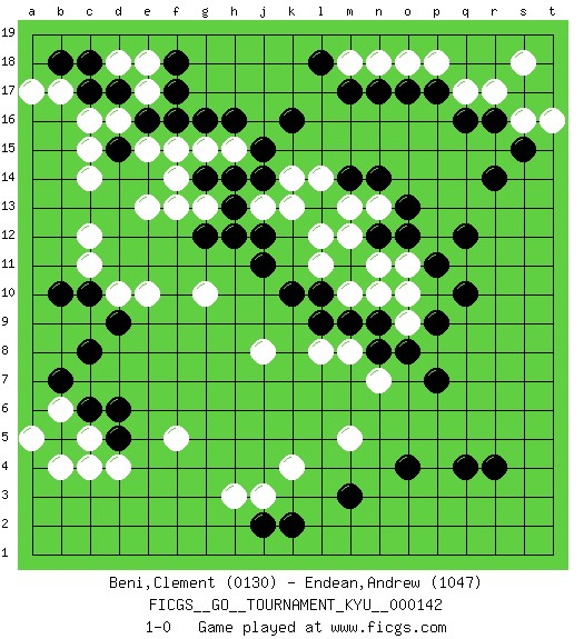 Last move : 1-0 2013 March 23 13:55:36 [Event "FICGS__GO__TOURNAMENT_KYU__000142"] [Site "FICGS"] [Date "2013.01.24"] [Round "1"] [Black "Beni,Clement"] [White "Endean,Andrew"] [Result "1-0"] [Rating 1 "0130"] [Rating 2 "1047"] 1.q16 d16 2.q4 d4 3.q10 d10 4.k16 k4 5.k10 r17 6.r16 q17 7.p17 p18 8.o17 o18 9.n17 n18 10.m17 m18 11.c6 c5 12.b5 b4 13.d5 c4 14.d6 b6 15.b7 a5 16.c8 f5 17.b10 c12 18.c10 c11 19.d9 e10 20.m3 m5 21.o4 j8 22.l18 s16 23.s15 t16 24.r14 s18 25.k2 h3 26.j2 j3 27.f17 e17 28.f16 c14 29.e16 e18 30.f18 e15 31.r4 n7 32.g14 e13 33.d15 c15 34.d17 c16 35.c18 d18 36.c17 b17 37.b18 a17 38.p7 o9 39.q12 o11 40.n8 m8 41.n9 n10 42.m9 m10 43.l9 l8 44.o8 l12 45.o13 n13 46.n12 m12 47.o12 n11 48.n14 m13 49.j11 j13 50.g12 g13 51.h13 f13 52.h12 k13 53.l10 l11 54.j14 k14 55.j15 f14 56.m14 l14 57.p9 o10 58.p11 g15 59.h14 f15 60.g16 h15 61.h16 g10 62.j12 1-0 Here are the names of the openings (joseki) played in the four corners : Corner q16 : q16 r17 Hoshi (Hwajeom, Seongjeom, Xingwei`) 4-4 Point. The star or hoshi (4-4) point, emphasizing influence at the potential expense of territory. Corner d4 : d4 c6 Hoshi (Hwajeom, Seongjeom, Xingwei`) 4-4 Point. The star or hoshi (4-4) point, emphasizing influence at the potential expense of territory. Ikken Kakari (Hankan Keolch'im, Yi Gua`jiao~, 1-Space Low Approach). Black 2 is the standard approach move to the 4-4. Player Black won this Go (weiqi, baduk) game. Follow this game move after move (download)Strange things happen at the one-two points. (Anonymous) Life is like a game of cards: the hand you are dealt represents determinism; the way you play it is free will. (Jawaharlal Nehru)