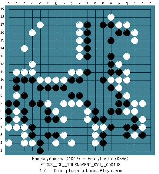 Last move : 1-0 2013 June 7 0:24:46 [Event "FICGS__GO__TOURNAMENT_KYU__000142"] [Site "FICGS"] [Date "2013.01.24"] [Round "1"] [Black "Endean,Andrew"] [White "Paul,Chris"] [Result "1-0"] [Rating 1 "1047"] [Rating 2 "0586"] 1.q4 d16 2.d4 r16 3.p16 p17 4.q16 q17 5.o17 r15 6.o15 o18 7.n17 q13 8.o13 r6 9.r5 q6 10.o4 q10 11.o11 k17 12.l17 k16 13.l16 k15 14.l15 k14 15.l14 k13 16.l13 c14 17.d10 d12 18.d7 c3 19.d3 c4 20.c5 b5 21.c6 b6 22.b7 d2 23.e2 c2 24.e1 m3 25.n3 h3 26.f3 m4 27.o6 h5 28.f5 e17 29.k10 r3 30.q3 s5 31.r4 s4 32.s3 b8 33.a7 a4 34.a6 a2 35.a5 b4 36.c8 g2 37.g3 j2 38.m6 e10 39.e9 f10 40.f9 g10 41.g9 j11 42.j10 h10 43.h9 d11 44.c10 b11 45.b10 p9 46.o9 k11 47.l11 h7 48.j8 j7 49.k8 l5 50.m5 s7 51.p7 q8 52.p8 o10 53.n10 p10 54.p11 q11 55.q7 r7 56.p6 p12 57.o12 l6 58.l7 k7 59.g5 g6 60.f6 f7 61.e7 c11 62.b9 m2 63.n2 n4 64.n5 1-0 This go game has been lost on time (started : 2013.01.24 22:36:49) Here are the names of the openings (joseki) played in the four corners : Corner q16 : r16 p16 Komoku (Somok, Xiao~mu`) 3-4 Point. The komoku (3-4) point is the traditional corner enclosure move.. Ikken Takagakari (Hankan Nop'dakeolch'im, Yi Gaogua`jiao~, 1-Space High Approach). The 5-4 approach move has become more popular in modern times, as modern Go emphasizes speed and influence. Corner q4 : q4 r6 Hoshi (Hwajeom, Seongjeom, Xingwei`) 4-4 Point. The star or hoshi (4-4) point, emphasizing influence at the potential expense of territory. Ikken Kakari (Hankan Keolch'im, Yi Gua`jiao~, 1-Space Low Approach). White 2 is the standard approach move to the 4-4. Player Black won this Go (weiqi, baduk) game. Follow this game move after move (download)Don't overlook the edge of the board. (Anonymous) A woman without a man is like a fish without a bicycle. (Gloria Steinem)