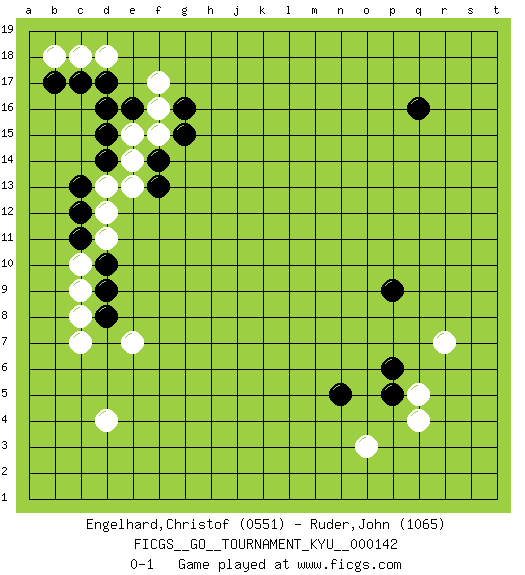 Last move : 0-1 2013 March 18 17:53:22 [Event "FICGS__GO__TOURNAMENT_KYU__000142"] [Site "FICGS"] [Date "2013.01.24"] [Round "1"] [Black "Engelhard,Christof"] [White "Ruder,John"] [Result "0-1"] [Rating 1 "0551"] [Rating 2 "1065"] 1.d16 q4 2.p5 q5 3.p6 o3 4.n5 r7 5.p9 d4 6.q16 f17 7.g16 f16 8.g15 f15 9.d15 e14 10.d14 d13 11.c13 d12 12.c12 d11 13.c11 c10 14.d10 c9 15.d9 c8 16.d8 c7 17.f14 e13 18.f13 e15 19.e16 d18 20.d17 c18 21.c17 b18 22.b17 e7 0-1 Here are the names of the openings (joseki) played in the four corners : Corner q4 : q4 p5 Hoshi (Hwajeom, Seongjeom, Xingwei`) 4-4 Point. The star or hoshi (4-4) point, emphasizing influence at the potential expense of territory. Corner d16 : d16 f17 Hoshi (Hwajeom, Seongjeom, Xingwei`) 4-4 Point. The star or hoshi (4-4) point, emphasizing influence at the potential expense of territory. Ikken Kakari (Hankan Keolch'im, Yi Gua`jiao~, 1-Space Low Approach). White 2 is the standard approach move to the 4-4. Player White won this Go (weiqi, baduk) game. Follow this game move after move (download)Capture what you cut off. (Anonymous) Looking at the proliferation of personal web pages on the Net, it looks like very soon everyone on Earth will have 15 megabytes of fame. (M.G. Sriram)