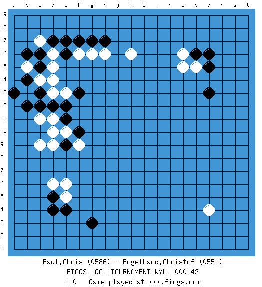 Last move : 1-0 2013 March 18 17:52:15 [Event "FICGS__GO__TOURNAMENT_KYU__000142"] [Site "FICGS"] [Date "2013.01.24"] [Round "1"] [Black "Paul,Chris"] [White "Engelhard,Christof"] [Result "1-0"] [Rating 1 "0586"] [Rating 2 "0551"] 1.q16 q4 2.d17 p15 3.p16 o15 4.q15 o16 5.q13 k16 6.h17 d15 7.c15 c14 8.c16 d16 9.e17 f16 10.f17 g16 11.g17 h16 12.d4 e5 13.d5 e6 14.e4 d6 15.g3 c9 16.b14 b13 17.c13 d14 18.b12 b15 19.a13 c17 20.b16 d13 21.d12 d11 22.e12 e13 23.e11 c11 24.c12 e10 25.f10 d9 26.e9 d10 27.f13 f9 28.e16 1-0 Here are the names of the openings (joseki) played in the four corners : Corner q16 : q16 p15 Hoshi (Hwajeom, Seongjeom, Xingwei`) 4-4 Point. The star or hoshi (4-4) point, emphasizing influence at the potential expense of territory. Corner d4 : d4 e5 Hoshi (Hwajeom, Seongjeom, Xingwei`) 4-4 Point. The star or hoshi (4-4) point, emphasizing influence at the potential expense of territory. Player Black won this Go (weiqi, baduk) game. Follow this game move after move (download)Territory is a closed space where time no longer exists. The transformation around it slower alter it, and sometimes it cracks open like a rotten egg at the least shock. (Pierre Audouard) If everyone is thinking alike, then somebody isn't thinking. (US General George S. Patton)