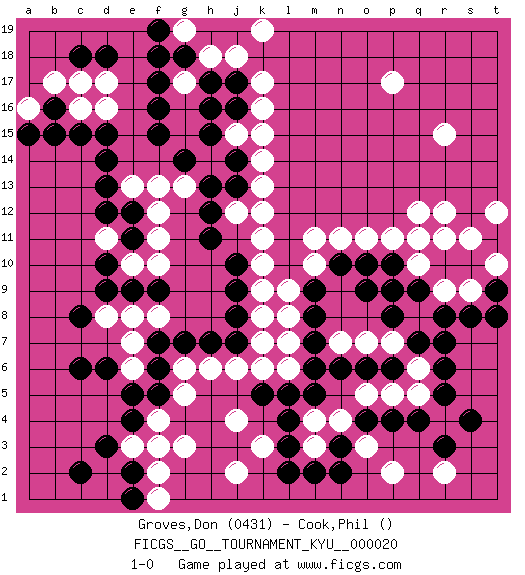 Last move : 1-0 2007 March 3 5:35:23 [Event "FICGS__GO__TOURNAMENT_KYU__000020"] [Site "FICGS"] [Date "2007.01.25"] [Round "1"] [Black "Groves,Don"] [White "Cook,Phil"] [Result "1-0"] [Rating 1 "0431"] 1.q4 r15 2.d3 d17 3.c15 c16 4.d15 d16 5.b15 p17 6.f16 k16 7.r10 q12 8.c6 k3 9.n3 g3 10.d10 d8 11.r7 r12 12.f17 k13 13.j17 k17 14.j16 j15 15.h15 j18 16.h17 h18 17.f18 g17 18.h16 h14 19.j14 k15 20.f15 g13 21.g18 f13 22.d13 f10 23.e5 e10 24.e11 f11 25.e12 e13 26.d14 f12 27.d9 e8 28.c8 e6 29.d6 e7 30.f5 g5 31.f6 g6 32.f7 f8 33.g7 k7 34.n6 q10 35.q9 p7 36.o9 n7 37.m7 o7 38.o6 h6 39.h7 j6 40.j7 k8 41.j8 k9 42.j9 k10 43.j10 k11 44.j13 j12 45.h13 k14 46.g14 k12 47.h12 f4 48.h11 l6 49.m6 q11 50.m9 m11 51.b16 b17 52.c18 c17 53.d18 a16 54.a15 o11 55.l5 l7 56.m8 k6 57.k5 m10 58.n10 n11 59.o10 p11 60.p10 s11 61.s10 j4 62.l3 j2 63.l2 k19 64.e4 f2 65.e2 f1 66.e1 f3 67.e9 d11 68.d12 l9 69.f9 t10 70.t9 s9 71.t11 t12 72.s8 g19 73.f19 t10 74.t8 r11 75.p6 e3 76.c2 r9 77.r8 q8 78.p9 q6 79.r6 q5 80.r5 p5 81.p4 o5 82.q7 m4 83.m5 m3 84.m2 n4 85.l4 o3 86.n2 p2 87.o4 r4 88.r3 r2 89.s4 l8 90.p8 1-0 Here are the names of the openings (joseki) played in the four corners : Corner d16 : d17 c15 Komoku (Somok, Xiao~mu`) 3-4 Point. The komoku (3-4) point is the traditional corner enclosure move.. Ikken Kakari (Hankan Keolch'im, Yi Gua`jiao~, 1-Space Low Pincer). The small knight move is the basic approach move to the 3-4 point stone. It has been continually used for over four centuries. There are limitless variations, with new moves constantly being discovered. Black 2 opens the door to a treaure store of joseki. Player Black won this Go (weiqi, baduk) game. Follow this game move after move (download)The rectangular six is normally alive. (Anonymous) Wisdom doesn't necessarily come with age. Sometimes age just shows up all by itself. (Tom Watson)