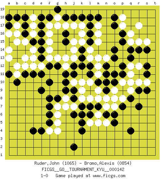 Last move : 1-0 2013 April 2 19:27:38 [Event "FICGS__GO__TOURNAMENT_KYU__000142"] [Site "FICGS"] [Date "2013.01.24"] [Round "1"] [Black "Ruder,John"] [White "Bromo,Alexis"] [Result "1-0"] [Rating 1 "1065"] [Rating 2 "0854"] 1.q4 d16 2.d4 q16 3.r14 q10 4.o17 r17 5.p15 p17 6.o18 p18 7.p16 q15 8.q14 r15 9.s14 s15 10.o14 k16 11.r7 p8 12.k4 m5 13.o6 n7 14.n6 m6 15.m7 m8 16.l7 l8 17.k7 k6 18.j6 j7 19.l6 l5 20.k5 k8 21.k6 n5 22.o5 o7 23.p7 o8 24.q8 q9 25.r9 r10 26.s9 s10 27.j8 h7 28.j9 k9 29.g8 h8 30.h9 g7 31.f7 g6 32.f6 g5 33.f5 g4 34.j2 f4 35.e4 g9 36.f8 j10 37.h10 g10 38.h11 g11 39.g12 h12 40.j11 k10 41.j12 h13 42.f12 f11 43.e11 f9 44.e9 g13 45.p11 p10 46.o10 o9 47.n11 n10 48.o11 m11 49.m10 m9 50.n9 l10 51.n10 n8 52.l11 m12 53.l12 m13 54.s12 q11 55.o13 o12 56.n12 n13 57.p12 q12 58.q13 r12 59.s11 l13 60.f10 f13 61.k13 j13 62.k14 l14 63.l15 m15 64.l16 m16 65.l17 m17 66.m18 k15 67.k18 k17 68.l18 j14 69.k12 e12 70.e13 d12 71.e14 f14 72.e15 f15 73.e16 f16 74.e17 f17 75.f18 g18 76.e18 d17 77.h18 h17 78.g19 g17 79.h15 j15 80.j18 j17 81.h16 d13 82.c14 d14 83.d15 c15 84.c16 b15 85.b14 b16 86.c17 d18 87.c18 b17 88.b18 c13 89.b13 b12 90.d11 c12 91.c11 b11 92.b10 a13 93.a11 a14 94.a17 a16 95.a18 1-0 Here are the names of the openings (joseki) played in the four corners : Corner q16 : q16 r14 Hoshi (Hwajeom, Seongjeom, Xingwei`) 4-4 Point. The star or hoshi (4-4) point, emphasizing influence at the potential expense of territory. Ikken Kakari (Hankan Keolch'im, Yi Gua`jiao~, 1-Space Low Approach). Black 2 is the standard approach move to the 4-4. Corner d16 : d16 h11 Hoshi (Hwajeom, Seongjeom, Xingwei`) 4-4 Point. The star or hoshi (4-4) point, emphasizing influence at the potential expense of territory. Player Black won this Go (weiqi, baduk) game. Follow this game move after move (download)Learn to play under the stones. (Anonymous) It's not the size of the dog in the fight, it's the size of the fight in the dog. (Mark Twain)
