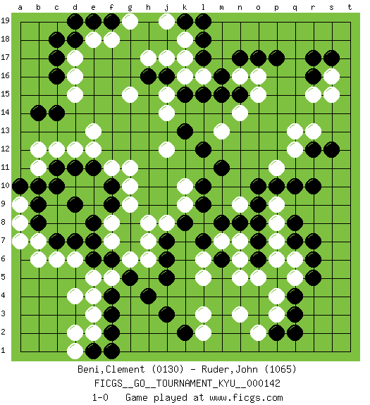 Last move : 1-0 2013 July 9 3:5:26 [Event "FICGS__GO__TOURNAMENT_KYU__000142"] [Site "FICGS"] [Date "2013.01.24"] [Round "1"] [Black "Beni,Clement"] [White "Ruder,John"] [Result "1-0"] [Rating 1 "0130"] [Rating 2 "1065"] 1.r16 d16 2.q3 d4 3.p17 q5 4.r7 p3 5.q4 p4 6.r5 q6 7.r6 p8 8.q10 q13 9.j3 l3 10.f3 e3 11.f4 c6 12.j5 l5 13.o10 k16 14.c14 c12 15.c17 d17 16.c16 d15 17.b14 e13 18.m16 n14 19.l15 j14 20.k15 j15 21.j16 j17 22.h16 k18 23.k13 g15 24.d7 e5 25.f6 f5 26.g5 g6 27.h4 h6 28.j6 f7 29.e6 e4 30.c7 b6 31.c10 b11 32.e8 h8 33.d11 d12 34.f10 g11 35.b10 a9 36.c11 b12 37.b9 a8 38.d9 d6 39.e7 j12 40.l12 m13 41.m11 o16 42.o17 p11 43.p10 s16 44.s17 r15 45.r17 s15 46.r12 r13 47.o6 p6 48.q7 p7 49.p2 o2 50.q2 n3 51.l7 m7 52.j7 j8 53.k8 k9 54.l9 k10 55.l10 g10 56.d18 e18 57.c18 f11 58.e11 e12 59.e19 f18 60.s12 n16 61.n17 l16 62.l17 k17 63.n15 o15 64.m15 f8 65.f9 g9 66.l18 h17 67.k19 j19 68.l19 q12 69.r10 n9 70.m6 l6 71.f2 e2 72.e1 d1 73.f1 d2 74.m8 n7 75.n8 n6 76.o7 n5 77.o8 o5 78.q8 p9 79.o9 h7 80.k2 l2 81.a10 b7 82.b8 a7 83.f19 g19 84.d19 1-0 This go game has been lost on time (started : 2013.01.24 22:36:49) Here are the names of the openings (joseki) played in the four corners : Corner q4 : q3 q5 Komoku (Somok, Xiao~mu`) 3-4 Point. The komoku (3-4) point is the traditional corner enclosure move.. Ikken Takagakari (Hankan Nop'dakeolch'im, Yi Gaogua`jiao~, 1-Space High Approach). The 5-4 approach move has become more popular in modern times, as modern Go emphasizes speed and influence. Corner d4 : d4 j3 Hoshi (Hwajeom, Seongjeom, Xingwei`) 4-4 Point. The star or hoshi (4-4) point, emphasizing influence at the potential expense of territory. Corner d16 : d16 c14 Hoshi (Hwajeom, Seongjeom, Xingwei`) 4-4 Point. The star or hoshi (4-4) point, emphasizing influence at the potential expense of territory. Ikken Kakari (Hankan Keolch'im, Yi Gua`jiao~, 1-Space Low Approach). Black 2 is the standard approach move to the 4-4. Player Black won this Go (weiqi, baduk) game. Follow this game move after move (download)Nothing requires doing this or that, but necessity exists. (Pierre Audouard) Internal peace cannot coexist with external war. (Don Groves)