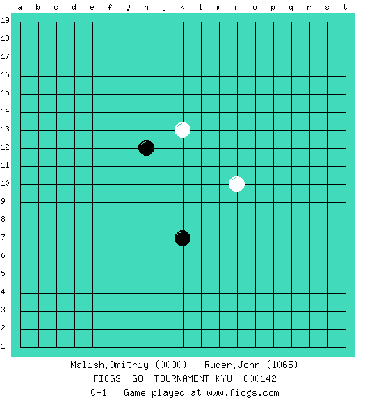 Last move : 0-1 2013 March 6 5:1:26 [Event "FICGS__GO__TOURNAMENT_KYU__000142"] [Site "FICGS"] [Date "2013.01.24"] [Round "1"] [Black "Malish,Dmitriy"] [White "Ruder,John"] [Result "0-1"] [Rating 1 "0000"] [Rating 2 "1065"] 1.k7 k13 2.h12 n10 0-1 This go game has been lost on time (started : 2013.01.24 22:36:49) Here are the names of the openings (joseki) played in the four corners : Player White won this Go (weiqi, baduk) game. Follow this game move after move (download)On the second line six die, eight live. (Anonymous) At last I discovered the true beauty of chess. So I proposed to her. (Dinesh De Silva)