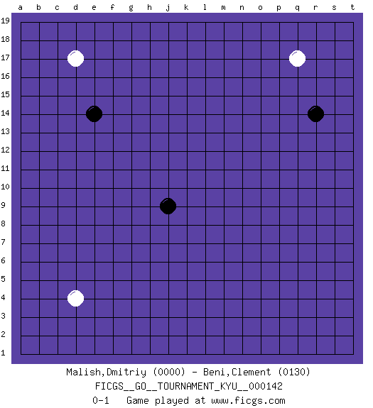 Last move : 0-1 2013 February 27 16:24:38 [Event "FICGS__GO__TOURNAMENT_KYU__000142 "] [Site "FICGS"] [Date "2013.01.24"] [Round "1"] [Black "Malish,Dmitriy "] [White "Beni,Clement "] [Result "0-1"] [Rating 1 "0000"] [Rating 2 "0130"] 1.r14 d4 2.j9 d17 3.e14 q17 0-1 This go game has been lost on time (started : 2013.01.24 22:36:49) Here are the names of the openings (joseki) played in the four corners : Corner d4 : d4 j9Hoshi (Hwajeom, Seongjeom, Xingwei`) 4-4 Point. The star or hoshi (4-4) point, emphasizing influence at the potential expense of territory. Corner d16 : d17 e14Komoku (Somok, Xiao~mu`) 3-4 Point. The komoku (3-4) point is the traditional corner enclosure move.. Corner q16 : r14 q17Oomokuhazushi 6-3 Point. The large mokuhazushi point (6-3), a remnant of the "new fuseki" movement in Japan in the 1930's. As an initial corner point, its popular usage has not stood the test of time.Komoku. Black continues with 3-3 or 3-2. Player White won this Go (weiqi, baduk) game.Follow this game move after move (download ) Win the stones, lose the game. (Anonymous) Programmer - an organism that turns coffee into software. (Anonymous)