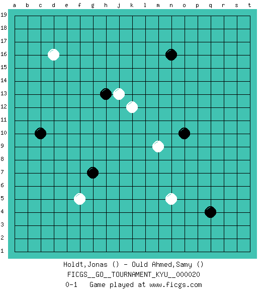 Last move : 0-1 2007 March 29 21:15:38 [Event "FICGS__GO__TOURNAMENT_KYU__000020"] [Site "FICGS"] [Date "2007.01.25"] [Round "1"] [Black "Holdt,Jonas"] [White "Ould Ahmed,Samy"] [Result "0-1"] 1.q4 d16 2.n16 n5 3.o10 m9 4.h13 k12 5.g7 f5 6.c10 j13 0-1 This go game has been lost on time (started : 2007.01.25 18:56:11) Here are the names of the openings (joseki) played in the four corners : Corner q4 : q4 n5 Hoshi (Hwajeom, Seongjeom, Xingwei`) 4-4 Point. The star or hoshi (4-4) point, emphasizing influence at the potential expense of territory. Corner d16 : d16 h13 Hoshi (Hwajeom, Seongjeom, Xingwei`) 4-4 Point. The star or hoshi (4-4) point, emphasizing influence at the potential expense of territory. Corner d4 : g7 f5 This joseki is unknown. A weak or weird move has probably been played in this corner. Player White won this Go (weiqi, baduk) game. Follow this game move after move (download)Keep sente in the opening. A premature attack loses sente. (Anonymous) This is where the fun begins. (Anakin Skywalker in Star Wars ep.3)