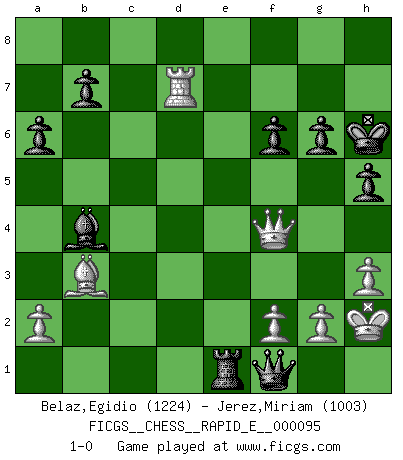Last move : 1-0 2013 May 2 9:46:24 [Event "FICGS__CHESS__RAPID_E__000095"] [Site "FICGS"] [Date "2013.01.26"] [Round "1"] [White "Belaz,Egidio"] [Black "Jerez,Miriam"] [Result "1-0"] [WhiteElo "1224"] [BlackElo "1003"] 1.e4 Nc6 2.Nf3 e5 3.Bc4 Bc5 4.O-O Nf6 5.Nc3 d5 6.exd5 e4 7.Re1 Ne7 8.d3 exd3 9.Qxd3 O-O 10.Bg5 Qd6 11.Nb5 Qb6 12.Rf1 Bf5 13.Qe2 Rfe8 14.Bxf6 gxf6 15.Nh4 Ng6 16.Qh5 Bxc2 17.Nxg6 fxg6 18.Qf3 Kg7 19.Qg3 a6 20.Na3 Qxb2 21.Nxc2 Qxc2 22.Bb3 Qb2 23.Qxc7+ Be7 24.d6 Qe5 25.Rfe1 Qxd6 26.Qc4 Rac8 27.Qg4 h5 28.Qf3 Qd7 29.Rad1 Qb5 30.h3 Bb4 31.Rxe8 Rxe8 32.Rd5 Re1+ 33.Kh2 Qf1 34.Rd7+ Kh6 35.Qf4+ 1-0 This chess game has been lost on time (started : 2013.01.26 21:14:53) KP : Nimzovich defense Kingside Castling by player White (move 4) Kingside Castling by player Black (move 9) Player White won this chess game. Follow this game move after move (download)If one piece is badly posted, the whole game is bad. (Tarrasch) Frage: Gibt es etwas was Sie mehr lieben als Autobahnen ohne Tempobegrenzungen? - Antwort: Deutsche Frauen ohne Tempobegrenzungen. (Loek van Wely) Jugadores de primera clase pierden en contra de jugadores de segunda clase porque los jugadores de segunda clase a veces juegan una partida de primer clase. (Siegbert Tarrasch) C'est la seule position que je connaisse où les deux camps sont mals. Propos prêtés à V. Anand. The obstacle is the path. (Zen proverb)