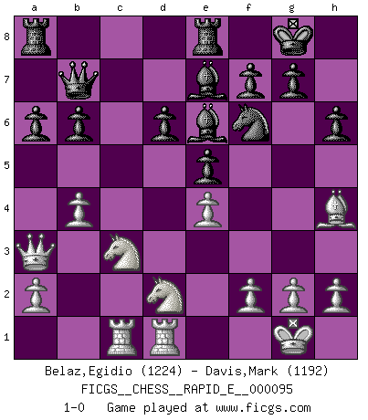 Last move : 1-0 2013 March 31 8:7:14 [Event "FICGS__CHESS__RAPID_E__000095"] [Site "FICGS"] [Date "2013.01.26"] [Round "1"] [White "Belaz,Egidio"] [Black "Davis,Mark"] [Result "1-0"] [WhiteElo "1224"] [BlackElo "1192"] 1.e4 c5 2.Bc4 Nc6 3.Qf3 Ne5 4.Qb3 Nxc4 5.Qxc4 e5 6.Nf3 d6 7.d3 Nf6 8.Bg5 Be7 9.b4 Be6 10.Qb5+ Qd7 11.Qa5 cxb4 12.c3 O-O 13.cxb4 b6 14.Qa3 h6 15.Bh4 Qb5 16.O-O Rfe8 17.Nc3 Qxd3 18.Rfd1 Qc4 19.Nd2 Qc8 20.Rac1 Qb7 21.Nb5 a6 22.Nc3 1-0 This chess game has been lost on time (started : 2013.01.26 21:14:53) Sicilian defense Kingside Castling by player Black (move 12) Kingside Castling by player White (move 16) Player White won this chess game. Follow this game move after move (download)Good positions don't win games, good moves do. (Gerald Abrahams) Im Wettkampf zwischen starken Meistern kommen Fehler sehr selten vor, deshalb ist es mit bloßem Warten nicht getan. (José Raúl Capablanca) No es suficiente ser un buen jugador, se debe también de jugar bién. (Siegbert Tarrasch) À la honte des hommes, on sait que les lois du jeu sont les seules qui soient partout justes, claires, inviolables et exécutées. Pourquoi l'Indien qui a donné les règles du jeu d'échecs est-il obéi de bon gré dans toute la terre, et que les décrétales des papes, par exemple, sont aujourd'hui un objet d'horreur et de mépris ? C'est que l'inventeur des échecs combina tout avec justesse pour la satisfaction des joueurs, et que les papes, dans leurs décrétales, n'eurent en vue que leur seul avantage. L'Indien voulut exercer également l'esprit des hommes et leur donner du plaisir; les papes ont voulu abrutir l'esprit des hommes. Voltaire (Dictionnaire philosophique / Garnier 1967) Yoga is 99% practice and 1% knowledge. (Sri Krishna Pattabhi Jois)