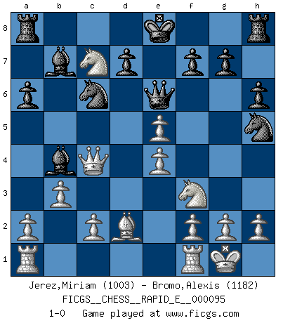 Last move : 1-0 2013 February 10 7:51:35 [Event "FICGS__CHESS__RAPID_E__000095"] [Site "FICGS"] [Date "2013.01.26"] [Round "1"] [White "Jerez,Miriam"] [Black "Bromo,Alexis"] [Result "1-0"] [WhiteElo "1003"] [BlackElo "1182"] 1.e4 e5 2.Nf3 Nc6 3.Nc3 Nf6 4.d4 a6 5.Bc4 b5 6.dxe5 bxc4 7.O-O Nh5 8.Qd5 h6 9.Qxc4 Bb7 10.b3 Bb4 11.Bd2 Qe7 12.Nd5 Qe6 13.Nxc7+ 1-0 Four knights : Scotch variation Kingside Castling by player White (move 7) Player White won this chess game. Follow this game move after move (download)Fischer, who may or may not be mad as a hatter, has every right to be horrified. (Jeremy Silman) Wer sich die Fähigkeit anerziehen will im Schach selbstständig zu denken, der muß alles meiden, was leblos ist: ausgeklügelte Theorien, die sich auf sehr wenige Beispiele und eine Menge Hirngespinste stützen. (Emanuel Lasker) No es tiempo de jugar al Ajedrez cuando la casa esta en llamas. (Proverbio Italiano) L'action d'une oeuvre littéraire se déroule sur un champ de bataille. Les masques et les types du drame moderne correspondent aux pièces du jeu d'échecs. L'intrigue correspond aux coups et aux gambits, c'est à dire aux techniques du jeu telles qu'utilisées et interprétées par les joueurs. Les tactiques et les péripéties [mouvements] correspondent aux coups exécutés par l'adversaire. (Viktor Shklovsky) A proverb is a short sentence based on long experience. (Miguel de Cervantes)
