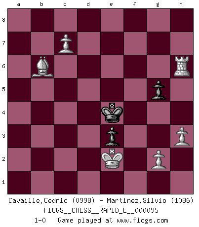 Last move : 1-0 2013 May 9 10:13:15 [Event "FICGS__CHESS__RAPID_E__000095"] [Site "FICGS"] [Date "2013.01.26"] [Round "1"] [White "Cavaille,Cedric"] [Black "Martinez,Silvio"] [Result "1-0"] [WhiteElo "0998"] [BlackElo "1086"] 1.d4 Nf6 2.c4 d6 3.Nc3 c5 4.e4 cxd4 5.Qxd4 e5 6.Qd1 Nc6 7.Nf3 Be7 8.Be2 O-O 9.O-O b6 10.a3 a5 11.Nd5 h6 12.Bd3 Bg4 13.Nxf6+ Bxf6 14.Be3 Rb8 15.Be2 Bh4 16.Qd2 Qf6 17.b4 Rfd8 18.Nxh4 Qxh4 19.Bxg4 Qxg4 20.h3 Qxe4 21.Rfd1 Nd4 22.Bxd4 Re8 23.Qe3 Qxe3 24.Bxe3 e4 25.Rxd6 axb4 26.Rxb6 Rxb6 27.Bxb6 b3 28.Rb1 Re6 29.Rxb3 f5 30.c5 Kf7 31.a4 Ke7 32.a5 Kd7 33.a6 Kc6 34.a7 Re8 35.Ra3 g5 36.a8Q+ Rxa8 37.Rxa8 f4 38.Rh8 e3 39.Rxh6+ Kb5 40.fxe3 fxe3 41.Kf1 Kc4 42.Ke2 Kd4 43.c6 Ke4 44.c7 1-0 This chess game has been lost on time (started : 2013.01.26 21:14:53) Old Indian defense Kingside Castling by player Black (move 8) Kingside Castling by player White (move 9) Promotion Queen by player White (move 36) 10 pieces endgame at move 40 : White KRBPPPP , Black KPP WHITE : King + 1 Rook 1 Bishop 4 Pawns BLACK : King + 2 Pawns 9 pieces endgame at move 40 : White KRBPPP , Black KPP WHITE : King + 1 Rook 1 Bishop 3 Pawns BLACK : King + 2 Pawns Player White won this chess game. Follow this game move after move (download)Chess mastery essentially consists of analyzing Chess positions accurately. (Mikhail Botvinnik) Meine Liebe ist Schach, Schach, Schach. Ich muss jeden Tag Schach spielen, deshalb fühle ich mich so stark. (Miguel Najdorf) El Ajedrez es el juego mas altamente simbólico, pero las agresiones estan por lo tanto aún mas francamente representadas en la partida. Tal vez comenzo como un juego de guerra; Algo como la representación de una batalla en miniatura entre las fuerzas de dos reinos. (Karl Meninger) La guerre est enfant de la passion, la passion est enfant du narcissisme et le narcissisme est l'enfant. (...) Une autre partie ? (Thibault de Vassal) The next best thing to gambling and winning is gambling and loosing. (Nick Dandalos)