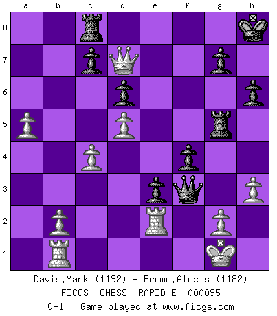 Last move : 0-1 2013 March 30 7:6:1 [Event "FICGS__CHESS__RAPID_E__000095"] [Site "FICGS"] [Date "2013.01.26"] [Round "1"] [White "Davis,Mark"] [Black "Bromo,Alexis"] [Result "0-1"] [WhiteElo "1192"] [BlackElo "1182"] 1.e4 e5 2.Nf3 Nc6 3.Bb5 d6 4.h3 Bd7 5.Nc3 Nf6 6.d3 a6 7.Bxc6 Bxc6 8.Bg5 Be7 9.O-O h6 10.Bxf6 Bxf6 11.Nd5 Bxd5 12.exd5 O-O 13.Rb1 Re8 14.Re1 b5 15.c3 Rc8 16.Qb3 Bg5 17.Nxg5 Qxg5 18.c4 bxc4 19.dxc4 Kh8 20.Qb7 f5 21.a4 f4 22.Qxa6 e4 23.Qc6 e3 24.f3 Re5 25.a5 Qg3 26.Re2 Rg5 27.Qd7 Qxf3 0-1 This chess game has been lost on time (started : 2013.01.26 21:14:53) Ruy Lopez : Old Steinitz defense Kingside Castling by player White (move 9) Kingside Castling by player Black (move 12) Player Black won this chess game. Follow this game move after move (download)Bobby is the most misunderstood, misquoted celebrity walking the face of this earth. (Yasser Seirawan) Zeige mir drei Eröffnungsvarianten und ich beweise dir, dass zwei davon inkorrekt sind. (Emanuel Lasker) Puntos débiles o agujeros en la posición de tu oponente deben de ser ocupados por piezas, no Peones. (Siegbert Tarrasch) Les réformistes prétendent que les progrès de la théorie conduiront à la disparition des échecs, et qu'il faut, pour leur rendre vie, en remanier les règles. En réalité, qu'exprime cette affirmation? Le mépris de l'intuition, de l'imagination et de tous les autres éléments qui font des échecs un art. (Alexander Alekhine) Looking at the proliferation of personal web pages on the Net, it looks like very soon everyone on Earth will have 15 megabytes of fame. (M.G. Sriram)