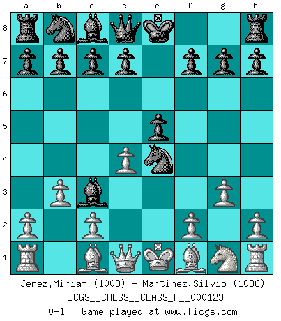 Last move : 0-1 2013 February 3 2:4:47 [Event "FICGS__CHESS__CLASS_F__000123"] [Site "FICGS"] [Date "2013.01.30"] [Round "1"] [White "Jerez,Miriam"] [Black "Martinez,Silvio"] [Result "0-1"] [WhiteElo "1003"] [BlackElo "1086"] 1.e4 e5 2.d4 Nf6 3.Nc3 Bb4 4.g3 Nxe4 5.b3 Bxc3+ 0-1 King's pawn game Player Black won this chess game. Follow this game move after move (download)A man without frontiers. He didn't divide the East and the West, he brought them together in their admiration for him. (Ljubomir Ljubojevic, about Bobby Fischer's death) Ja, ich habe einmal eine Blitzpartie gespielt, es war in einem Zug, 1929. --im Interview 1989 (Mikhail Moiseyevich Botvinik) Dejen al perfeccionista jugar por correo. (Yasser Seirawan) Les échecs, c'est l'art d'analyser. (Mikhail Botvinnik) See no evil, hear no evil, speak no evil. (The 3 monkeys)