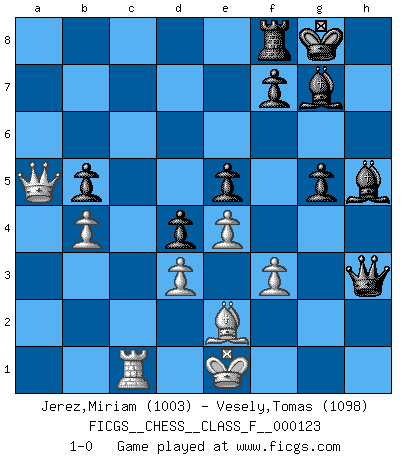 Last move : 1-0 2013 July 21 3:47:44 [Event "FICGS__CHESS__CLASS_F__000123"] [Site "FICGS"] [Date "2013.01.30"] [Round "1"] [White "Jerez,Miriam"] [Black "Vesely,Tomas"] [Result "1-0"] [WhiteElo "1003"] [BlackElo "1098"] 1.e4 c5 2.c4 Nc6 3.Nc3 Nf6 4.Nf3 e5 5.b3 d6 6.Be2 Bg4 7.O-O h6 8.h3 Bh5 9.Bb2 g5 10.a4 Bg7 11.d3 a6 12.g4 Bg6 13.Re1 Qb8 14.Ba3 Nd4 15.a5 b5 16.cxb5 axb5 17.Nxd4 cxd4 18.Nd5 Rxa5 19.Bxd6 Rxa1 20.Qxa1 Qxd6 21.Rc1 O-O 22.Nxf6+ Qxf6 23.f3 Qf4 24.b4 Qg3+ 25.Kf1 Qxh3+ 26.Ke1 h5 27.gxh5 Bxh5 28.Qa5 1-0 Sicilian defense Kingside Castling by player White (move 7) Kingside Castling by player Black (move 21) Player White won this chess game. Follow this game move after move (download)During a Chess competition a Chessmaster should be a combination of a beast of prey and a monk. (Alexander Alekhine) Ich bin Weltmeister und muß mit niemandem irgend etwas diskutieren. (Viswanathan Anand) Las ideas audaces son como las piezas del Ajedrez que avanzan hacia adelante. Ellas pueden ser vencidas, pero también pueden iniciar una partida victoriosa. (Goethe) Les Echecs ne sont pas pour les âmes timides. Ils requièrent un homme entier, qui ne s'arrête pas aveuglément à ce qui a été déjà établi, mais qui tente individuellement de sonder les profondeurs du jeu. (W. Steinitz) The Movers & Shakers of this world are those who play chess in the mornings and go to the disco in the evenings. (Dinesh De Silva)