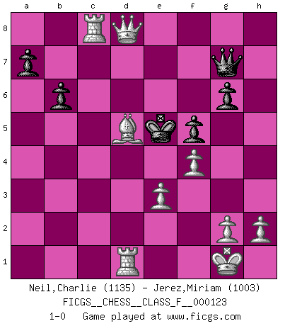 Last move : 1-0 2013 April 10 9:38:53 [Event "FICGS__CHESS__CLASS_F__000123"] [Site "FICGS"] [Date "2013.01.30"] [Round "1"] [White "Neil,Charlie"] [Black "Jerez,Miriam"] [Result "1-0"] [WhiteElo "1135"] [BlackElo "1003"] 1.d4 d5 2.c4 b6 3.Nc3 Nf6 4.cxd5 Nxd5 5.Nf3 Nc6 6.e3 e5 7.Bb5 Bb7 8.Nxe5 Qf6 9.Nxd5 Qd6 10.Qf3 Qe6 11.Nxc7+ Ke7 12.Nxa8 Bxa8 13.Nxc6+ Bxc6 14.Bxc6 g6 15.O-O Bh6 16.Bd2 f5 17.Bb4+ Kf6 18.Rac1 Qxa2 19.Bc3 Rc8 20.d5 Kf7 21.Qh3 Rg8 22.Rfd1 Bg7 23.Bxg7 Rxg7 24.d6 Qxb2 25.d7 Rg8 26.Qxh7+ Rg7 27.Bd5+ Ke7 28.Qxg7+ Qxg7 29.Bb7 Kd8 30.Rc8+ Ke7 31.d8Q+ Ke6 32.Bd5+ Ke5 33.f4+ 1-0 Queen's Gambit Kingside Castling by player White (move 15) Promotion Queen by player White (move 31) Player White won this chess game. Follow this game move after move (download)The way he plays Chess demonstrates a man's whole nature. (Stanley Ellin) Konzentriere dich auf materielle Gewinne. Nimm, was dir dein Gegner gibt, ausser es gibt einen guten Grund der dagegenspricht. (Robert James Fischer) En manos de Fischer's, una diminuta ventaja teórica es tan buena como tener una Reina de ventaja. (Isaac Kashdan) Votre prénom est 'Tactique', votre deuxième prénom est 'Tactique' et votre nom est 'Tactique'. (Ken Smith) I find your interest interesting. (Gregory House, House M.D.)