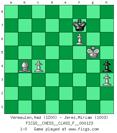 Last move : 1-0 2013 July 17 15:25:58 [Event "FICGS__CHESS__CLASS_F__000123"] [Site "FICGS"] [Date "2013.01.30"] [Round "1"] [White "Vermeulen,Aad"] [Black "Jerez,Miriam"] [Result "1-0"] [WhiteElo "1200"] [BlackElo "1003"] 1.e4 e5 2.Nf3 Nc6 3.Bb5 Nge7 4.O-O a6 5.Bc4 d5 6.exd5 Nxd5 7.h3 Bc5 8.d3 O-O 9.Bxd5 Qxd5 10.Nc3 Qd6 11.Ne4 Qe7 12.Nxc5 Qxc5 13.Re1 Bf5 14.Nh4 Be6 15.Nf3 h6 16.c3 Rad8 17.Qe2 b5 18.Be3 Qe7 19.b3 a5 20.Rad1 Qf6 21.Bd2 a4 22.c4 bxc4 23.dxc4 Rd7 24.Bc3 Rxd1 25.Rxd1 Qg6 26.Nxe5 Nxe5 27.Qxe5 f6 28.Qxe6+ Qf7 29.Qxf7+ Rxf7 30.Rd8+ Rf8 31.Rxf8+ Kxf8 32.f4 Ke7 33.Kf2 c5 34.g4 axb3 35.axb3 Ke6 36.Ke3 g6 37.b4 cxb4 38.Bxb4 f5 39.gxf5+ gxf5 40.Kd4 Kd7 41.Ke5 h5 42.Kxf5 h4 43.Kg5 Ke6 44.f5+ Kf7 45.f6 1-0 Ruy Lopez : Cozio defense Kingside Castling by player White (move 4) Kingside Castling by player Black (move 8) 10 pieces endgame at move 38 : White KBPPPP , Black KPPP WHITE : King + 1 Bishop 4 Pawns BLACK : King + 3 Pawns 9 pieces endgame at move 39 : White KBPPPP , Black KPP WHITE : King + 1 Bishop 4 Pawns BLACK : King + 2 Pawns 8 pieces endgame at move 39 : White KBPPP , Black KPP WHITE : King + 1 Bishop 3 Pawns BLACK : King + 2 Pawns 7 pieces endgame at move 42 : White KBPPP , Black KP WHITE : King + 1 Bishop 3 Pawns BLACK : King + 1 Pawn Player White won this chess game. Follow this game move after move (download)Chess is life. (Bobby Fischer) Glücklicherweise sind Großmeister Ruben Fines reine Schachbücher weniger phallozentrisch [als seine Schachpsychologie] und deswegen auch weniger lächerlich. (Nigel Short) Buenas posiciones no logran ganar juegos, buenas movidas sí. (Gerald Abrahams) La victoire dans une partie d'Echecs appartient la plupart du temps à celui qui voit un peu plus loin que l'adversaire. (Lasker) Logic : The art of thinking and reasoning in strict accordance with the limitations and incapacities of the human misunderstanding. (Ambrose Bierce)