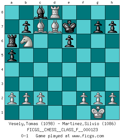 Last move : 0-1 2013 July 21 3:47:44 [Event "FICGS__CHESS__CLASS_F__000123"] [Site "FICGS"] [Date "2013.01.30"] [Round "1"] [White "Vesely,Tomas"] [Black "Martinez,Silvio"] [Result "0-1"] [WhiteElo "1098"] [BlackElo "1086"] 1.d4 d5 2.Nc3 Nf6 3.Nf3 Nc6 4.Ne5 Nxe5 5.dxe5 Ng4 6.Nxd5 Nxe5 7.Bf4 Qd6 8.e4 e6 9.Ne3 Qxd1+ 10.Rxd1 Be7 11.Bxe5 O-O 12.Bxc7 a6 13.e5 Ra7 14.Bb6 Ra8 15.Be2 a5 16.O-O Bg5 17.Bb5 Bf4 18.Nc4 f6 19.exf6 Rxf6 20.Rd8+ Rf8 21.Rfd1 Rxd8 22.Rxd8+ Kf7 23.Bd7 Bc7 24.Bxc7 Ke7 25.Nb6 Ra6 0-1 Queen's pawn : Chigorin variation Kingside Castling by player Black (move 11) Kingside Castling by player White (move 16) Player Black won this chess game. Follow this game move after move (download)When you see a good move, look for a better one. (Emanuel Lasker) Weshalb minderdergeübte Spieler mit g2-g4 beginnen? Die betreffenden sind unschlüssig, ob sie nun rechts (h4) oder links (f4) beginnen sollen, und in ihrer Ratlosigkeit entschliessen sie sich nach guter Bürgerart dazu, den goldenen Mittelweg zu wählen. (Aaron Nimzowitsch) Peones: ellos son el alma de esta partida, solos forman el ataque y la defensa. (Philidor) Aucun coup ne doit être joué sans but. (Pedro Damiano) A good aphorism is too hard for the tooth of time, and is not worn away with the centuries, although it serves as food for every speech. (Friedrich Nietzsche)