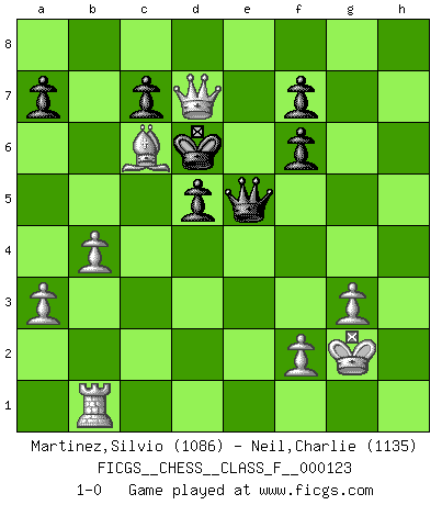 Last move : 1-0 2013 April 9 4:39:11 [Event "FICGS__CHESS__CLASS_F__000123"] [Site "FICGS"] [Date "2013.01.30"] [Round "1"] [White "Martinez,Silvio"] [Black "Neil,Charlie"] [Result "1-0"] [WhiteElo "1086"] [BlackElo "1135"] 1.e4 e5 2.Nf3 Nc6 3.Nc3 Nf6 4.d4 exd4 5.Nxd4 Bb4 6.Nxc6 bxc6 7.Bd2 Bxc3 8.Bxc3 O-O 9.Bd3 d6 10.O-O Be6 11.h3 Re8 12.b4 Qd7 13.Bxf6 gxf6 14.a3 Rab8 15.c4 Kg7 16.Qf3 Rg8 17.Rfe1 Kf8 18.Rab1 Bxh3 19.g3 Re8 20.Qf4 Re5 21.Qh6+ Ke8 22.Qxh7 Qg4 23.Be2 Qxe4 24.Qxh3 Qg6 25.Kg2 Qe4+ 26.Bf3 Qxc4 27.Qc8+ Ke7 28.Qxg8 Qc3 29.Rxe5+ Qxe5 30.Bxc6 d5 31.Qe8+ Kd6 32.Qd7+ 1-0 Four knights : Scotch, 4...exd4 Kingside Castling by player Black (move 8) Kingside Castling by player White (move 10) Player White won this chess game. Follow this game move after move (download)Many Chess players were surprised when after the game, Fischer quietly explained: 'I had already analyzed this possibility' in a position which I thought was not possible to foresee from the opening. (Mikhail Tal) Kleine Schachspieler machen Mist, und große Schachspieler machen Mist, aber große machen weniger Mist. (Fritz Sämisch) Cuando veas una buena jugada, trata de encontrar otra mejor. (Emanuel Lasker) Le jeu d'échecs est comme rejeté hors du temps. (Antoine de Saint-Exupéry) If you lose the game you should win the analysis! (Proverb)