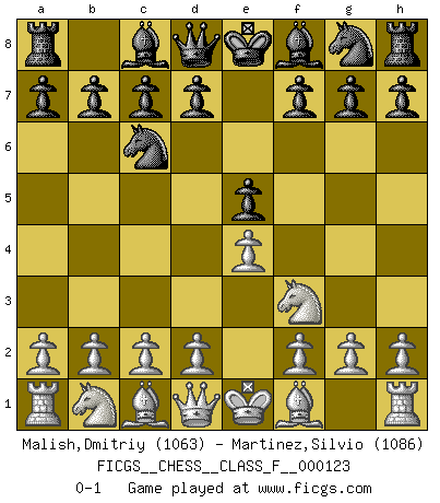 Last move : 0-1 2013 March 12 17:36:0 [Event "FICGS__CHESS__CLASS_F__000123"] [Site "FICGS"] [Date "2013.01.30"] [Round "1"] [White "Malish,Dmitriy"] [Black "Martinez,Silvio"] [Result "0-1"] [WhiteElo "1063"] [BlackElo "1086"] 1.e4 e5 2.Nf3 Nc6 0-1 This chess game has been lost on time (started : 2013.01.30 20:44:34) King's pawn game Player Black won this chess game. Follow this game move after move (download)A strong memory, concentration, imagination, and a strong will is required to become a great Chess player. (Bobby Fischer) Frage: Was machen Sie mit den Preisen? Anwort: Ich habe Angst, dass meine Freundin davon neue Kleider kauft. (Loek van Wely) Después de una mala apertura, hay una esperanza en el juego medio. Pero una vez que estas en finales, el momento de la verdad ha llegado. (Edmar Mednis) On peut tirer plus d'utilité d'une partie perdue que de 100 parties gagnées. (Capablanca) Computers have lots of memory but no imagination. (Anonymous)
